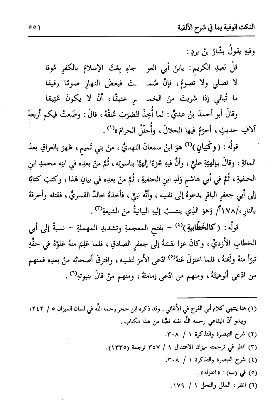 قولُهُ: (كالخَطّابيِةِ) (¬4) - بفتحِ المعجمةِ وتشديدِ المهملةِ - نسبةً إلى أبي الخطابِ الأزديِّ، وكانَ عزا نفسهُ إلى جعفر الصادقِ، فلما عَلِمَ منهُ غلوَّهُ في حقِّهِ تبرّأ منهُ ولَعَنهُ، فلما اعتزلَ عَنهُ (¬5) ادّعى الأمرَ لنفسِهِ، وافترقَ أصحابهُ منْ بعدهِ فمنهم: من ادّعى ألوهيتَهُ، ومنهم من ادّعى إمامتَهُ، ومنهم منْ قالَ بنبوتهِ (¬6).