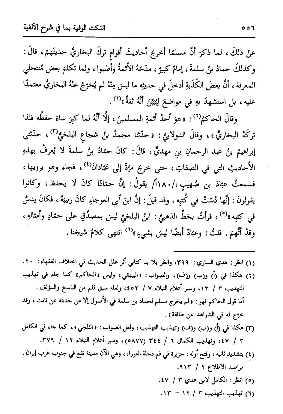 وقالَ الحاكمُ (¬2): ((هوَ أحدُ أئمةِ المسلمينَ، إلاَّ أنَّهُ لما كبرَ ساءَ حفظهُ فلذا تركَهُ البخاريُّ))، وقالَ الدولابيُّ: ((حدّثنا محمدُ بنُ شجاعٍ البلخيُّ (¬3)، حدّثني إبراهيمُ بنُ عبد الرحمانِ بنِ مهديٍّ، قالَ: كانَ حمّادُ بنُ سلمةَ لا يُعرفُ بهذهِ الأحاديثِ التي في الصفاتِ، حتى خرجَ مرَّةً إلى عَبّادانَ (¬4)، فجاءَ وهو يرويها، فسمعتُ عبّادَ بنَ صُهيبٍ، /180 أ/ يقولُ: إنَّ حمّاداً كانَ لا يحفظ، وكانوا يقولونَ: إنَّها دُسّتْ في كُتبهِ، وقد قيلَ: إنَّ ابنَ أبي العوجاءِ كانَ ربيبَهُ، فكانَ يدسُّ في كتبهِ (¬5)))، قرأتُ بخطِّ الذهبيِّ: ابنُ البلخيِّ ليسَ بمصدِّقٍ على حمّادٍ وأمثالهِ، وقدْ أتُّهمَ. قلتُ: وعبّادٌ أيضاً ليسَ بشيءٍ (¬6))) انتهى كلامُ شيخِنا.
