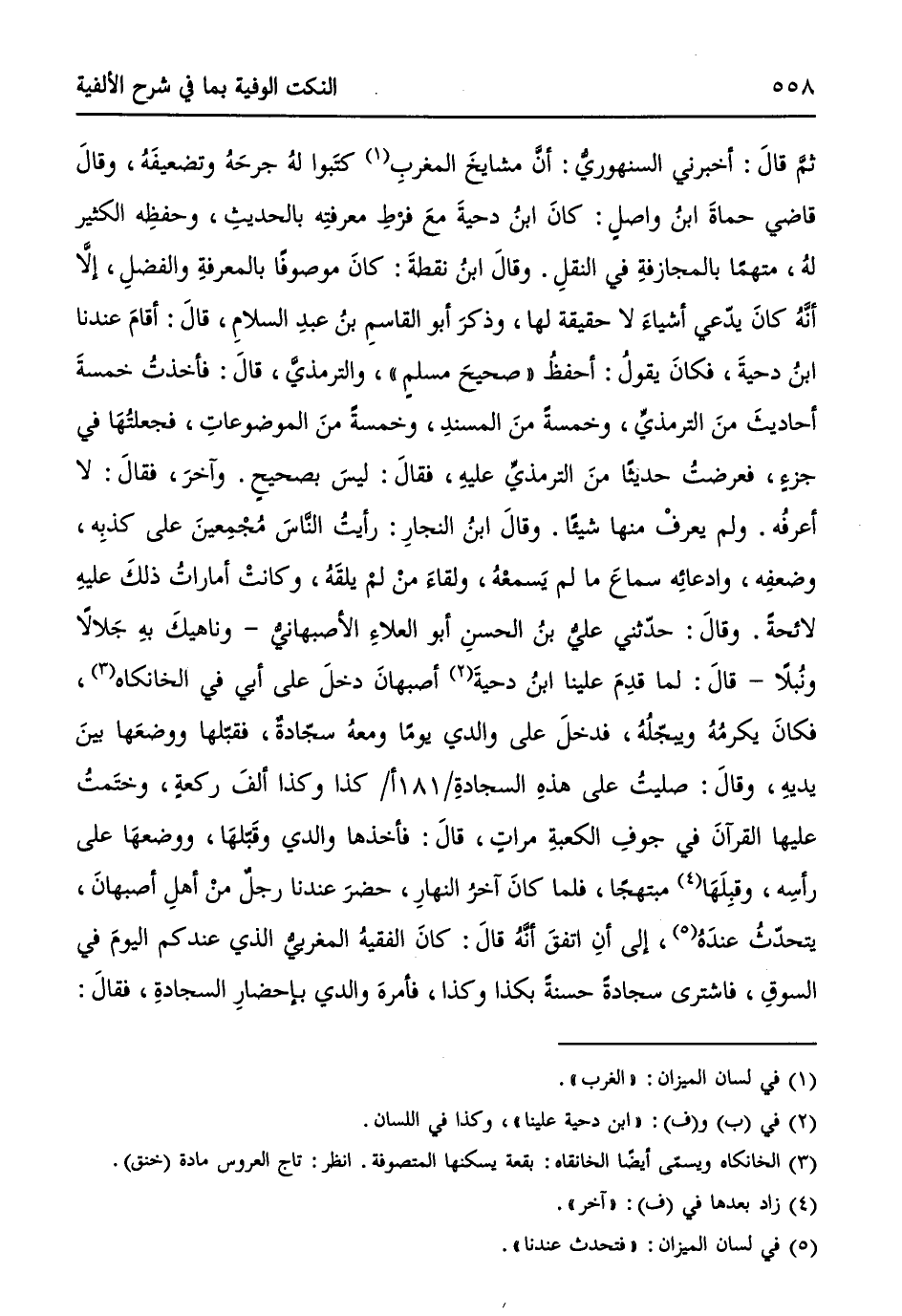 ثمَّ قالَ: أخبرني السنهوريُّ: أنَّ مشايخَ المغربِ (¬1) كتبوا لهُ جرحَهُ وتضعيفَهُ، وقالَ قاضي حماةَ ابنُ واصلٍ: كانَ ابنُ دحيةَ معَ فرْطِ معرفتهِ بالحديثِ، وحفظهِ الكثير لهُ، متهماً بالمجازفةِ في النقلِ. وقالَ ابنُ نقطةَ: كانَ موصوفاً بالمعرفةِ والفضلِ، إلاَّ أنّهُ كانَ يدّعي أشياءَ لا حقيقةَ لها، وذكرَ أبو القاسمِ بنُ عبدِ السلامِ، قالَ: أقامَ عندنا ابنُ دحيةَ، فكانَ يقولُ: أحفظُ "صحيحَ مسلمٍ"، والترمذيَّ، قالَ: فأخذتُ خمسةَ أحاديثَ منَ الترمذيِّ، وخمسةً منَ المسندِ، وخمسةً منَ الموضوعاتِ، فجعلتُهَا في جزءٍ، فعرضتُ حديثاً منَ الترمذيِّ عليهِ، فقالَ: ليسَ بصحيحٍ. وآخرَ، فقالَ: لا أعرفهُ. ولمْ يعرفْ منها شيئاً. وقالَ ابنُ النجارِ: رأيتُ النَّاسَ مُجْمِعينَ على كذبهِ، وضعفهِ، وادعائهِ سماعَ ما لَم يسمعْهُ، ولقاءَ منْ لمْ يلقهُ، وكانتْ أماراتُ ذلكَ عليهِ لائحةً. وقالَ: حدّثني عليُّ بنُ الحسنِ أبو العلاءِ الأصبهانيُّ - وناهيكَ بهِ جَلالاً ونُبلاً- قالَ: لما قدِمَ علينا ابنُ دحيةَ (¬2) أصبهانَ دخلَ على أبي في الخانكاه (¬3)، فكانَ يكرمُهُ ويبجّلُهُ، فدخلَ على والدي يوماً ومعهُ سجّادةٌ، فقبّلها ووضعَها بينَ يديهِ، وقالَ: صليتُ على هذهِ السجادةِ / 181 أ / كذا وكذا ألف ركعةٍ، وختمتُ عليها القرآنَ في جوفِ الكعبةِ مراتٍ، قالَ: فأخذها والدي وقَبَّلهَا، ووضعهَا على رأسهِ، وقبِلَهَا (¬4) مبتهِجاً، فلما كانَ آخرُ النهارِ، حضرَ عندنا رجلٌ منْ أهلِ أصبهانَ، يتحدّثُ عندَهُ (¬5)، إلى أنِ اتفقَ أنَّهُ قالَ: كانَ الفقيهُ المغربيُّ الذي عندكمْ اليومَ في السوقِ، فاشترى سجادةً حسنةً بكذا وكذا، فأمرَ والدي بإحضارِ السجادةِ، فقالَ: