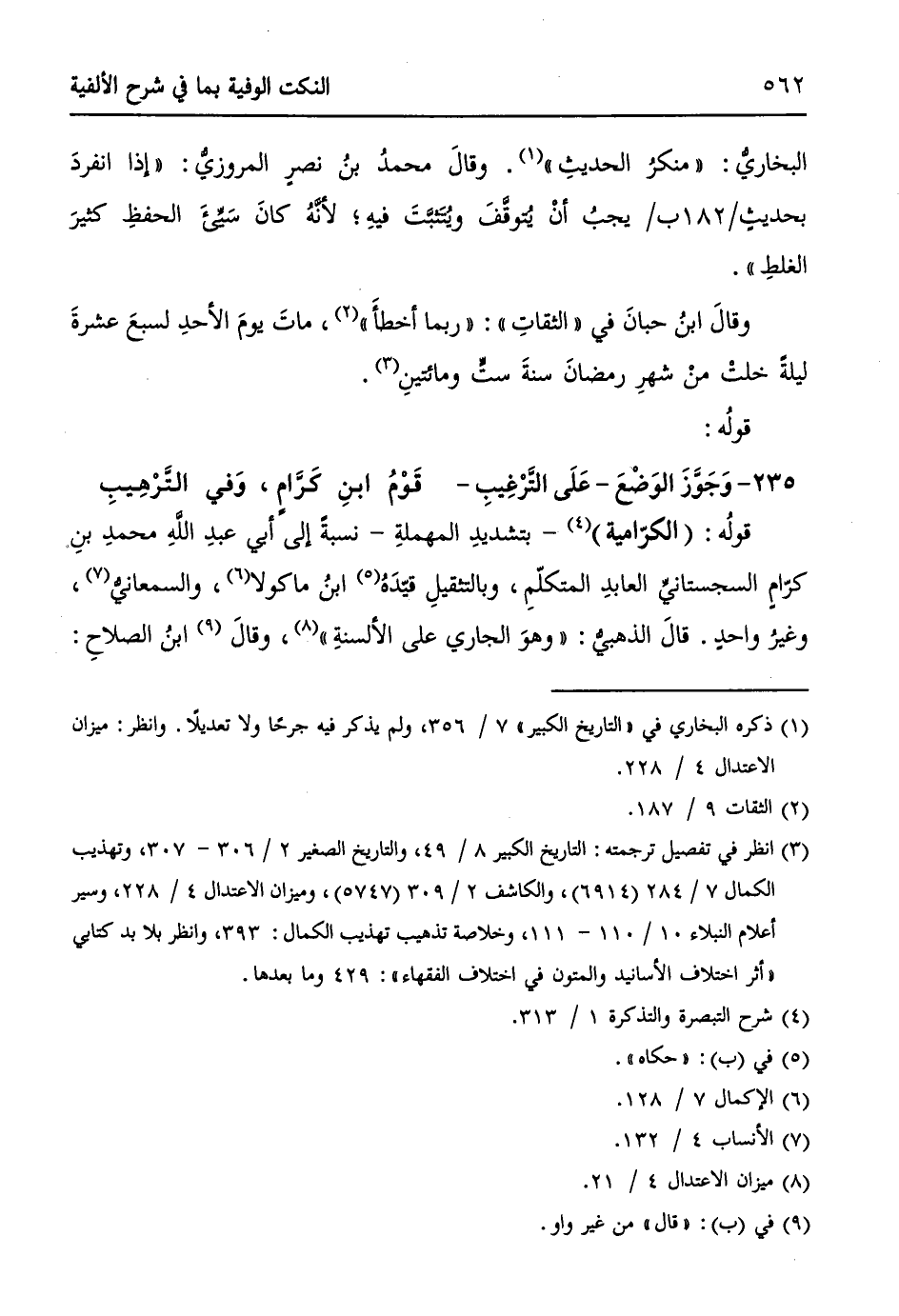 قولهُ: (الكرّامية) (¬4) - بتشديدِ المهملةِ - نسبةً إلى أبي عبدِ اللهِ محمدِ بنِ كرّامٍ السجستانيِّ العابدِ المتكلّمِ، وبالتثقيلِ قيّدَهُ (¬5) ابنُ ماكولا (¬6)، والسمعانيُّ (¬7)، وغيرُ واحدٍ. قالَ الذهبيُّ: ((وهوَ الجاري على الألسنةِ)) (¬8)، وقالَ (¬9) ابنُ الصلاحِ: