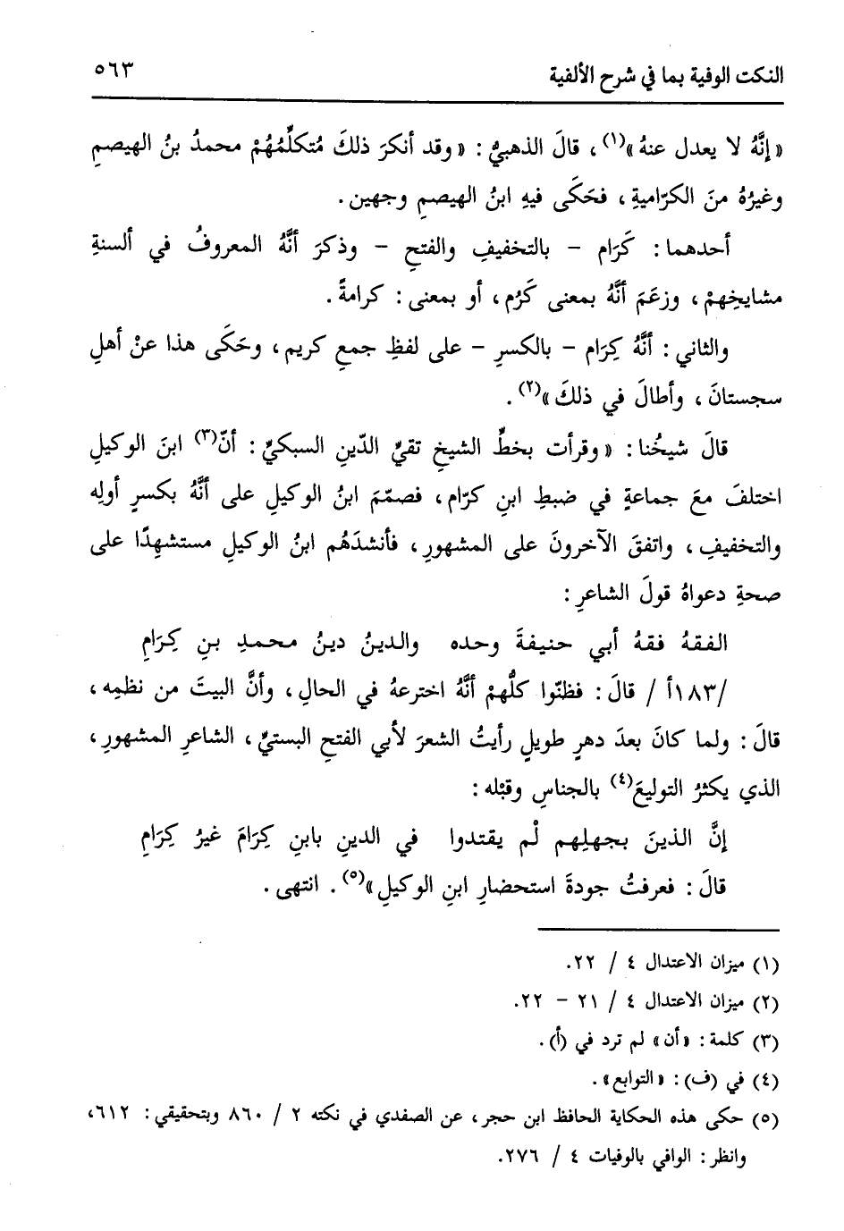 قالَ شيخُنا: ((وقرأت بخطِّ الشيخِ تقيِّ الدّينِ السبكيِّ: أنّ (¬3) ابنَ الوكيلِ اختلفَ معَ جماعةٍ في ضبطِ ابنِ كرّام، فصمّمَ ابنُ الوكيلِ على أنَّهُ بكسرِ أولهِ والتخفيفِ، واتفقَ الآخرونَ على المشهورِ، فأنشدَهُمْ ابنُ الوكيلِ مستشهِداً على صحةِ دعواهُ قولَ الشاعرِ: