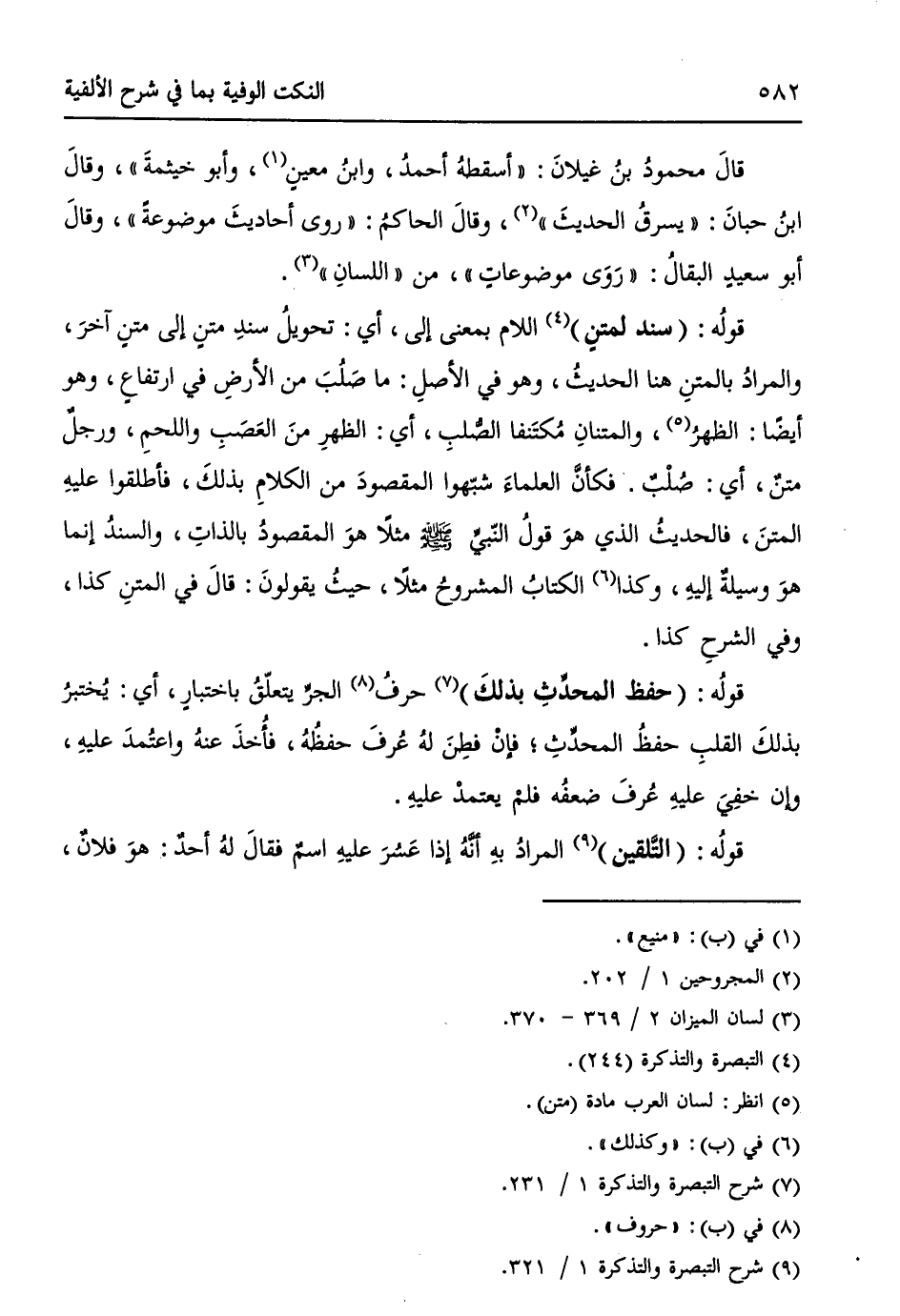 قولهُ: (سندٍ لمتنٍ) (¬4) اللام بمعنى إلى، أي: تحويلُ سندِ متنٍ إلى متنٍ آخرَ، والمراد بالمتنِ هنا الحديثُ، وهو في الأصلِ: ما صَلُبَ من الأرضِ في ارتفاعٍ، وهو أيضاً: الظهرُ (¬5)، والمتنانِ مُكَتَنفا الصُّلبِ، أي: الظهرِ منَ العَصَبِ واللحمِ، ورجلٌ متنٌ، أي: صُلْبٌ. فكأنَّ العلماء شبهّوا المقصودَ من الكلامِ بذلكَ، فأطلقوا عليهِ المتنَ، فالحديثُ الذي هوَ قولُ النّبيِّ - صلى الله عليه وسلم - مثلاً هوَ المقصودُ بالذاتِ، والسندُ إنما هوَ وسيلةٌ إليهِ، وكذا (¬6) الكتابُ المشروحُ مثلاً، حيثُ يقولونَ: قالَ في المتنِ كذا، وفي الشرحِ كذا.