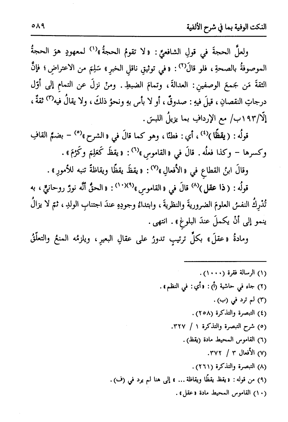 ولعلَّ الحجةَ في قولِ الشافعيِّ: ((لا تقومُ الحجةُ)) (¬1) لمعهودٍ هوَ الحجةُ الموصوفةُ بالصحةِ، فلو قالَ (¬2): ((في توثيقِ ناقلِ الخبرِ)) سَلِمَ من الاعتراضِ؛ فإنَّ الثقةَ مَن جَمعَ الوصفينِ: العدالةَ، وتمامَ الضبطِ. ومنْ نزلَ عن التمامِ إلى أوّلِ درجاتِ النقصانِ، قيلَ فيهِ: صدوقٌ، أو لا بأس بهِ ونحوُ ذلكَ، ولا يقالُ فيه (¬3) ثقةٌ، إلاّ / 193ب / مع الإردافِ بما يزيلُ اللبسَ.