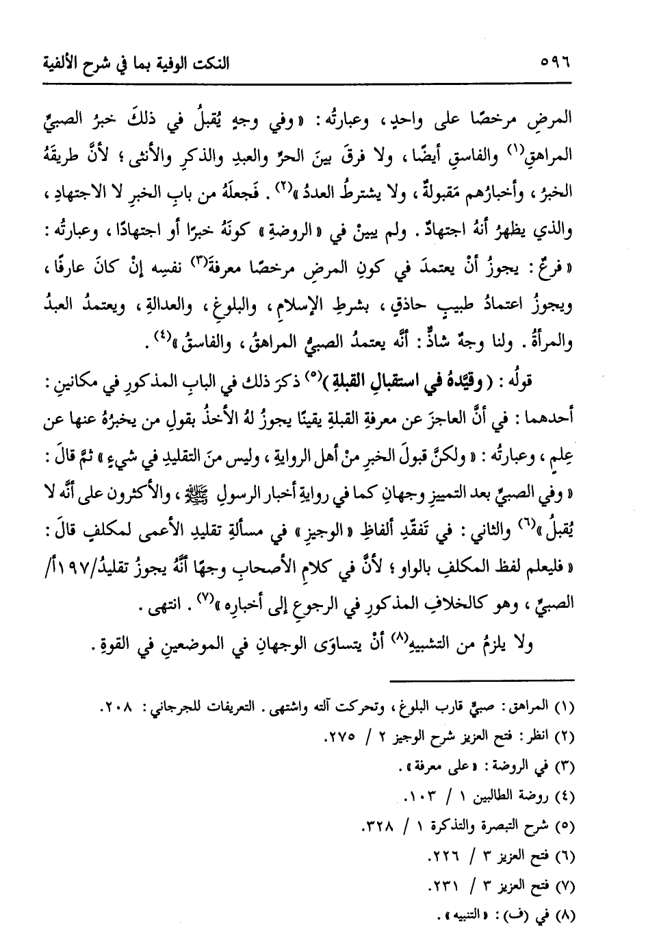 قولهُ: (وقيَّدهُ في استقبالِ القبلةِ) (¬5) ذكرَ ذلك في البابِ المذكورِ في مكانينِ: أحدهما: في أنَّ العاجزَ عن معرفةِ القبلةِ يقيناً يجوزُ لهُ الأخذُ بقولِ من يخبرُهُ عنها عن عِلمٍ، وعبارتهُ: ((ولكنَّ قبولَ الخبرِ منْ أهل الروايةِ، وليس منَ التقليدِ في شيءٍ)) ثمَّ قالَ: ((وفي الصبيِّ بعد التمييزِ وجهانِ كما في روايةِ أخبار الرسولِ - صلى الله عليه وسلم -، والأكثرون على أنَّه لا يُقبلُ)) (¬6) والثاني: في تَفقّدِ ألفاظِ " الوجيزِ " في مسألةِ تقليدِ الأعمى لمكلفٍ قالَ: ((فليعلمَ لفظ المكلفِ بالواو؛ لأنَّ في كلامِ الأصحابِ وجهاً أنَّهُ يجوزُ تقليدُ / 197أ / الصبيِّ، وهو كالخلافِ المذكورِ في الرجوعِ إلى أخبارهِ)) (¬7). انتهى.