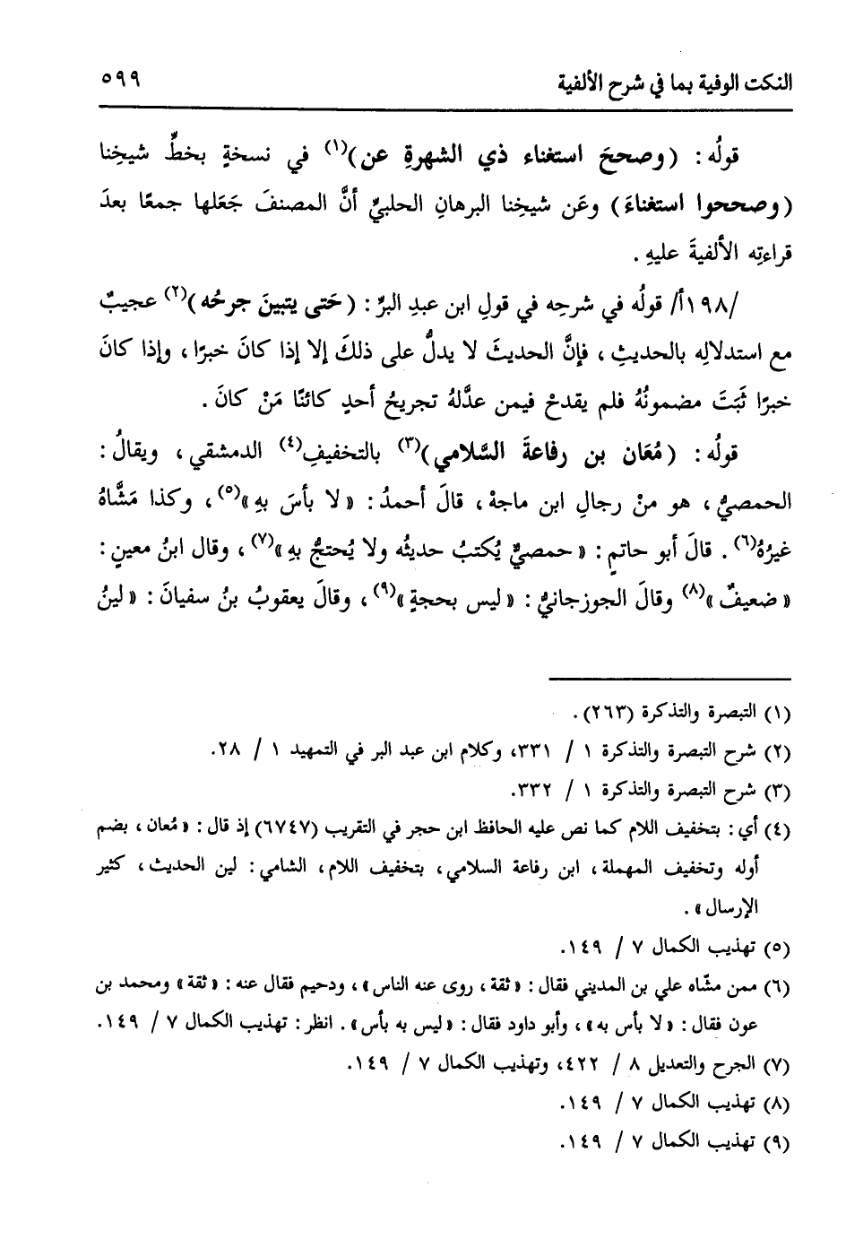 قولهُ: (وصححَ استغناءُ ذي الشهرةِ عن) (¬1) في نسخةٍ بخطِ شيخنا (وصححوا استغناءَ) وعَن شيخِنا البرهانِ الحلبيِّ أنَّ المصنفَ جَعَلها جمعاً بعدَ قراءتهِ الألفيةَ عليهِ / 198أ /.