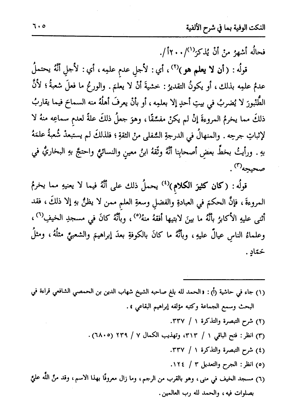 قولهُ: (كان كثيرَ الكلامِ) (¬4) يحملُ ذلك على أنَّهُ فيما لا يعنيهِ مما يخرمُ المروءةَ، فإنَّ الحكمَ في العبادةِ والفضلِ وسعةِ العلمِ ممن لا يظنُّ بهِ إلا ذلكَ، فقد أثنى عليهِ الأكابرُ بأنَّهُ ما بينَ لابتيها أفقهُ منهُ (¬5)، وبأنَّهُ كانَ في مسجدِ الخيفِ (¬6)، وعلماءُ الناس عيالٌ عليهِ، وبأنَّهُ ما كانَ بالكوفةِ بعدَ إبراهيمَ والشعبيِّ مثلُهُ، ومثلُ حَمّادٍ.