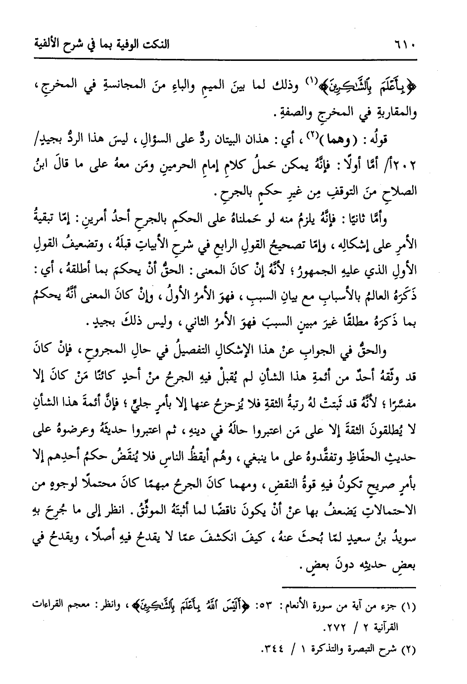 وأمَّا ثانياً: فإنَّهُ يلزمُ منه لو حَملناهُ على الحكمِ بالجرحِ أحدُ أمرينِ: إمّا تبقيةُ الأمرِ على إشكالهِ، وإمّا تصحيحُ القولِ الرابعِ في شرحِ الأبياتِ قبلهُ، وتضعيفُ القولِ الأولِ الذي عليهِ الجمهورُ؛ لأنَّهُ إنْ كانَ المعنى: الحقُ أنْ يحكمَ بما أطلقهُ، أي: ذَكَرَهُ العالم بالأسبابِ مع بيانِ السببِ، فهوَ الأمرُ الأولُ، وإنْ كانَ المعنى أنَّه يحكمُ بما ذَكرَهُ مطلقاً غيرَ مبينٍ السببَ فهوَ الأمرُ الثاني، وليس ذلكَ بجيدٍ.