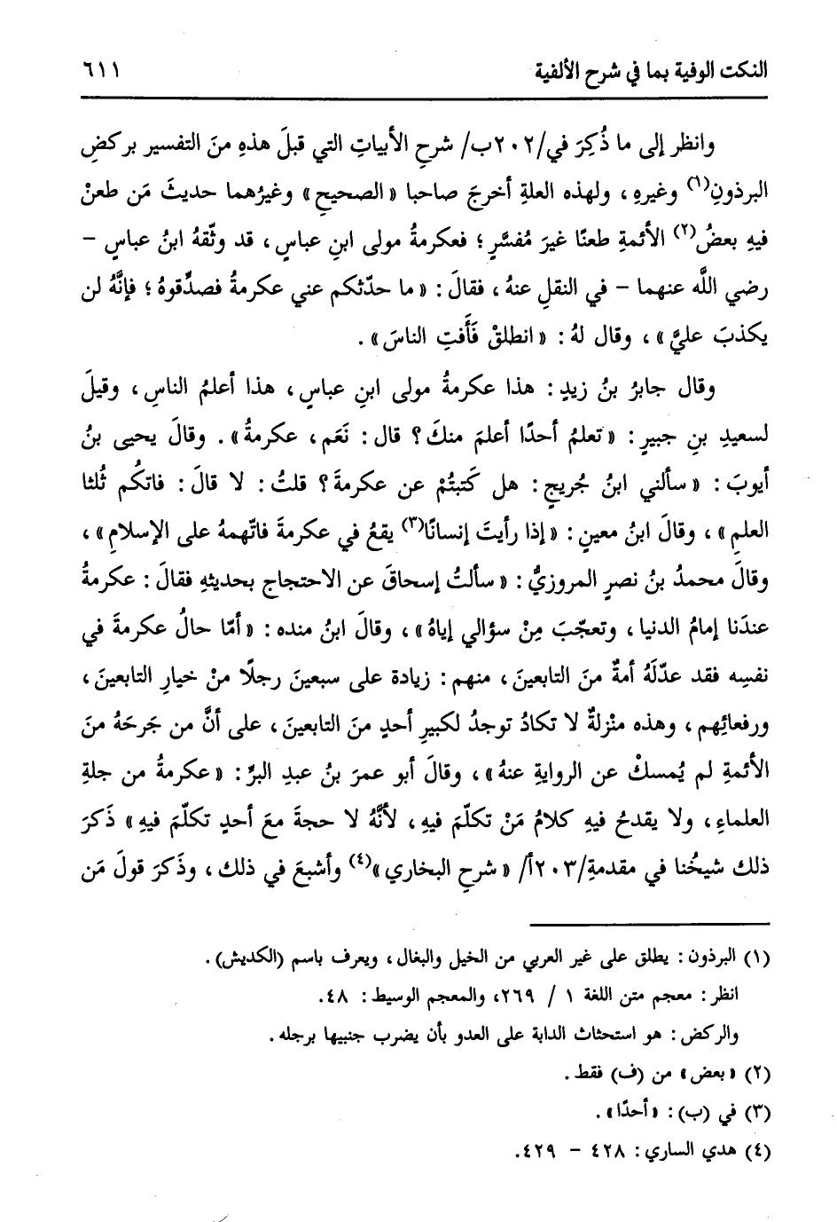 وانظر إلى ما ذُكِرَ في / 202ب / شرحِ الأبياتِ التي قبلَ هذهِ منَ التفسير بركضِ البرذونِ (¬1) وغيرهِ، ولهذه العلة أخرجَ صاحبا " الصحيحِ " وغيرُهما حديثَ مَنْ طعنَ فيهِ بعضُ (¬2) الأئمة طعناً غيرَ مُفسَّرٍ؛ فعكرمةُ مولى ابنِ عباسٍ، قد وثّقهُ ابنُ عباسٍ -رضي اللهُ عنهما- في النقلِ عنهُ، فقالَ: ((ما حدّثكم عني عكرمةُ فصدِّقوهُ؛ فإنَّهُ لن يكذبَ عليَّ))، وقال لهُ: ((انطلقْ فَأَفتِ الناسَ)).