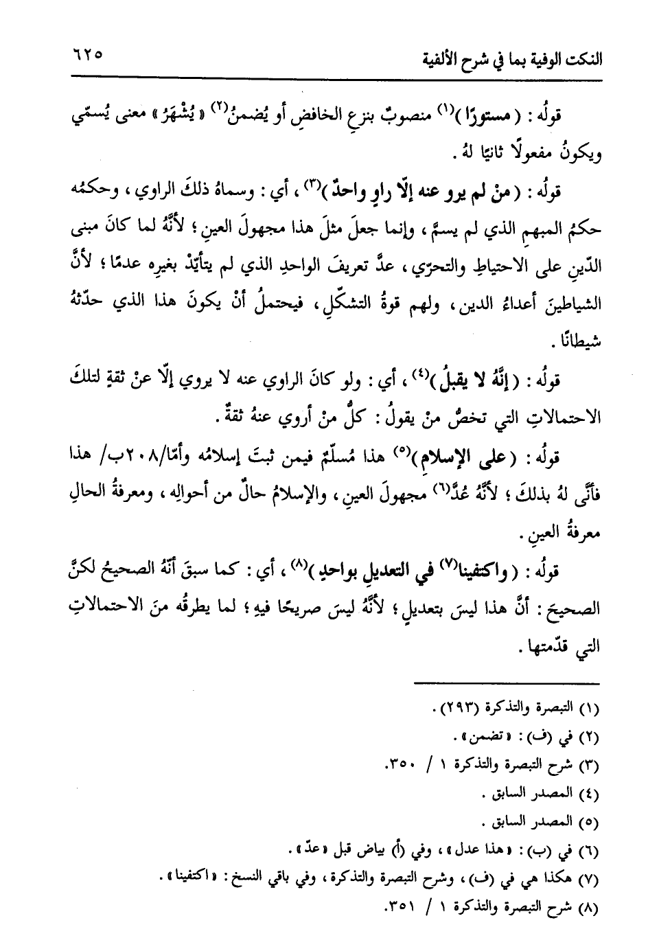 قولهُ: (منْ لم يرو عنهُ إلاّ راوٍ واحدٌ) (¬3)، أي: وسماهُ ذلكَ الراوي، وحكمهُ حكمُ المبهمِ الذي لم يسمَّ، وإنما جعلَ مثلَ هذا مجهولَ العينِ؛ لأنَّهُ لما كانَ مبنى الدّينِ على الاحتياطِ والتحرّي، عدَّ تعريفَ الواحدِ الذي لم يتأيّدْ بغيرهِ عدماً؛ لأنَّ الشياطينَ أعداءُ الدينِ، ولهم قوةُ التشكّلِ، فيحتملُ أنْ يكونَ هذا الذي حدّثهُ شيطاناً.
