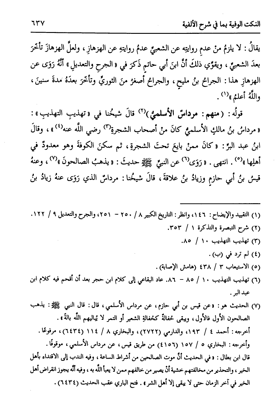 (¬7) الحديث هو: ((عن قيس بن أبي حازم، عن مرداس الأسلمي، قال: قال النبي - صلى الله عليه وسلم -: يذهب الصالحون الأول فالأول، ويبقى حُفالةٌ كحُفالةِ الشعير أو التمر لا يُباليهم الله بالةً)).