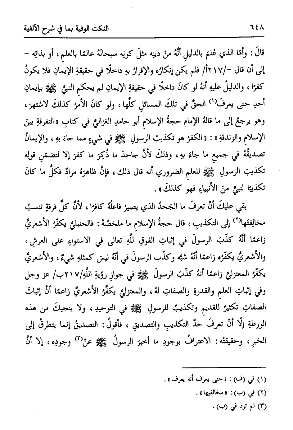 قالَ: وأمّا الذي عُلمَ بالدليلِ أنَّهُ منْ دينهِ مثلَ كونهِ سبحانهُ عالماً بالعلمِ، أو بذاتهِ - إلى أن قال - / 217أ / فلم يكن إنكارهُ والإقرارُ بهِ داخلاً في حقيقةِ الإيمانِ فلا يكونُ كفراً، والدليلُ عليهِ أنهُ لو كانَ داخلاً في حقيقةِ الإيمانِ لم يحكمِ النبيُّ - صلى الله عليه وسلم - بإيمانِ أحد حتى يعرفَ (¬1) الحقَ في تلكَ المسائلِ كلِّها، ولو كانَ الأمر كذلكَ لاشتهرَ، وهو يرجعُ إلى ما قالهُ الإمام حجةُ الإسلامِ أبو حامدٍ الغزاليُّ في كتابِ " التفرقةِ بينَ الإسلامِ والزندقةِ ": ((الكفرُ هو تكذيبُ الرسولِ - صلى الله عليه وسلم - في شيءٍ مما جاءَ بهِ، والإيمانُ تصديقُهُ في جميعِ ما جاءَ بهِ، وذلكَ لأنَّ جاحدَ ما ذُكِرَ ما كفرَ إلا لتضمّنِ قوله تكذيبُ الرسولِ - صلى الله عليه وسلم - للعلمِ الضروري أنه قال ذلك، فإنَّ ظاهرَهُ مرادٌ فكلُّ ما كانَ تكذيباً لنبيٍّ منَ الأنبياءِ فهو كذلكَ)).