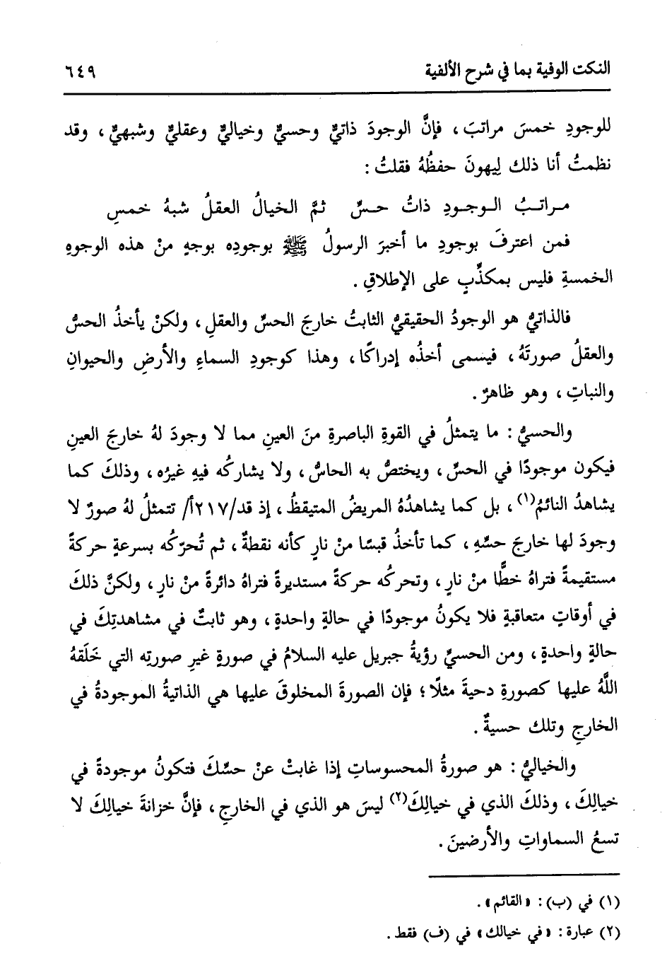 للوجودِ خمسَ مراتبَ، فإنَّ الوجودَ ذاتيٌّ وحسيٌّ وخياليٌّ وعقليٌّ وشبهيٌّ، وقد نظمتُ أنا ذلك لِيهونَ حفظُهُ فقلتُ: