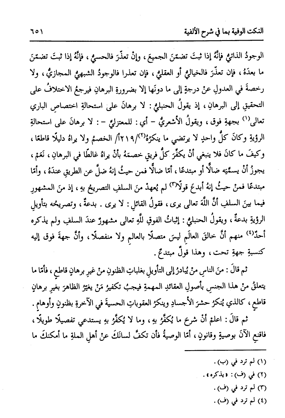 الوجودُ الذاتيُّ فإنَّهُ إذا ثبتَ تضمّنَ الجميعَ، وإنْ تعذّرَ فالحسيُّ، فإنَّهُ إذا ثبتَ تضمّنَ ما بعدهُ، فإن تعذّرَ فالخياليُّ أو العقليُّ، فإن تعذرا فالوجودُ الشبهيُّ المجازيُّ، ولا رخصةَ في العدولِ عنْ درجةٍ إلى ما دونها إلا بضرورةِ البرهانِ فيرجعُ الاختلافُ على التحقيقِ إلى البرهانِ، إذ يقولُ الحنبليُّ: لا برهانَ على استحالةِ اختصاصِ الباري تعالى (¬1) بجهةِ فوق، ويقولُ الأشعريُّ - أي: للمعتزليِّ -: لا برهانَ على استحالةِ الرؤيةِ وكانَ كلُّ واحدٍ لا يرتضي ما ينكرُهُ (¬2) / 219أ / الخصمُ ولا يراهُ دليلاً قاطعاً، وكيفَ ما كانَ فلا ينبغي أنْ يكفرَ كلُّ فريقٍ خصمَهُ بأنْ يراهُ غالطاً في البرهانِ، نَعَمْ، يجوزُ أنْ يسميهِ ضالاً أو مبتدعاً، أمّا ضالاً فمن حيثُ إنّهُ ضلَّ عن الطريقِ عندَهُ، وأمّا مبتدعاً فمنْ حيثُ إنهُ أبدعَ قولاً (¬3) لم يُعهدْ منَ السلفِ التصريحُ بهِ، إذ منَ المشهورِ فيما بينَ السلفِ أنَّ اللهَ تعالى يرى، فقولُ القائلِ: لا يرى بدعةٌ، وتصريحهُ بتأويلِ الرؤيةِ بدعةٌ، ويقولُ الحنبليُّ: إثباتُ الفوقِ للهِ تعالى مشهورٌ عندَ السلفِ ولم يذكر أحدٌ (¬4) منهم أنَّ خالقَ العالَمِ ليسَ متصلاً بالعالمِ ولا منفصلاً، وأنَّ جهةَ فوق إليه كنسبةِ جهةِ تحت، وهذا قولٌ مبتدعٌ.