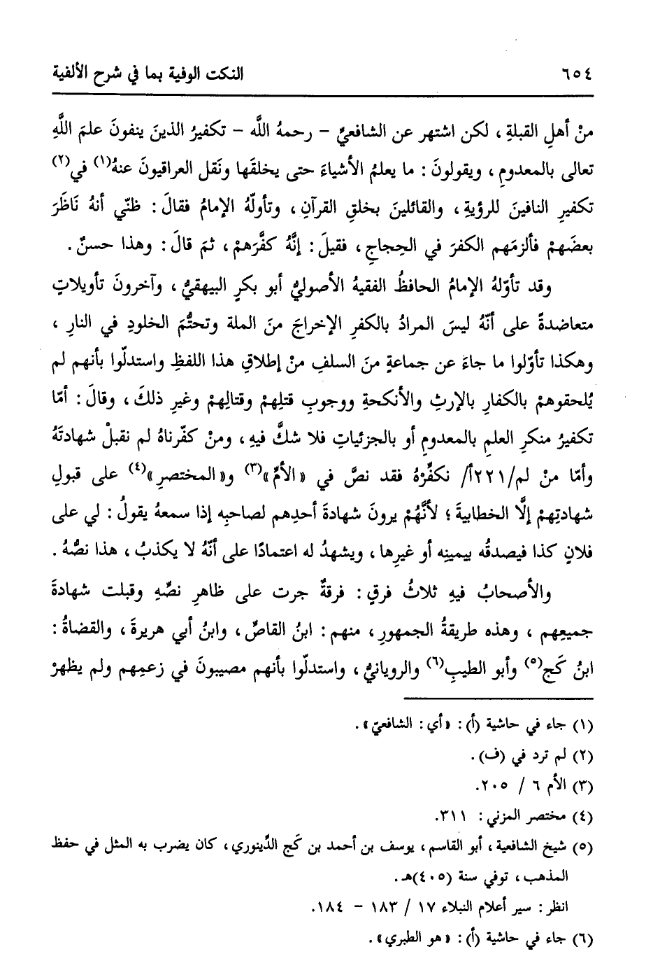 وقد تأوّلهُ الإمامُ الحافظُ الفقيهُ الأصوليُّ أبو بكرٍ البيهقيُّ، وآخرونَ تأويلاتٍ متعاضدةً على أنّهُ ليسَ المرادُ بالكفرِ الإخراجَ منَ الملة وتحتمَّ الخلودِ في النارِ وهكذا تأوّلوا ما جاءَ عن جماعةٍ منَ السلفِ منْ إطلاقِ هذا اللفظِ واستدلّوا بأنهم لم يلحقوهمْ بالكفارِ بالإرثِ والأنكحةِ ووجوبِ قتلهمْ وقتالهمْ وغيرِ ذلكَ، وقالَ: أمّا تكفيرُ منكرِ العلمِ بالمعدومِ أو بالجزئياتِ فلا شكَّ فيهِ، ومنْ كفّرناهُ لم نقبلْ شهادتَهُ وأمّا منْ لم / 221 أ / نكفّرهُ فقد نصَّ في " الأم " (¬3) و" المختصرِ " (¬4) على قبولِ شهادتِهمْ إلاَّ الخطابيةَ؛ لأنَّهُمْ يرونَ شهادةَ أحدهِم لصاحبهِ إذا سمعهُ يقولُ: لي على فلانٍ كذا فيصدقهُ بيمينهِ أو غيرِها، ويشهدُ له اعتماداً على أنّه لا يكذبُ، هذا نصهُ.