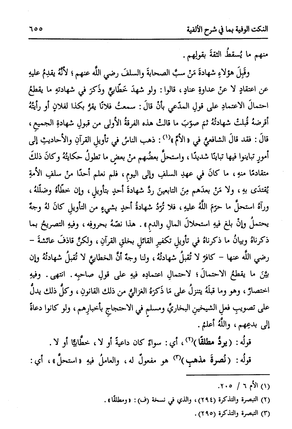 وقَبِلَ هؤلاءِ شهادةَ مَنْ سبَّ الصحابةَ والسلفَ - رضي الله عنهم -؛ لأنَّهُ يقدِمُ عليهِ عن اعتقادٍ لا عنْ عداوةِ عنادٍ، قالوا: ولو شهدَ خَطّابيٌّ وذَكرَ في شهادتهِ ما يقطعُ احتمالَ الاعتمادِ على قولِ المدّعي بأنْ قالَ: سمعتُ فلاناً يقرُّ بكذا لفلانٍ أو رأيتُهُ أقرضهُ قُبلتْ شهادتُهُ ثمَ صوّبَ ما قالتْ هذه الفرقةُ الأولى من قبولِ شهادةِ الجميعِ، قالَ: فقد قالَ الشافعيّ في " الأم " (¬1): ذهب الناس في تأويل القرآنِ والأحاديثِ إلى أمورٍ تباينوا فيها تبايناً شديداً، واستحلَّ بعضُهم منْ بعضٍ ما تطولُ حكايتُهُ وكانَ ذلكَ متقادماً منهِ، ما كانَ في عهدِ السلفِ وإلى اليومِ، فلم نعلم أحداً منْ سلف الأمةِ يُقتدَى بهِ، ولا مَنْ بعدَهم مِنَ التابعينَ ردَّ شهادةَ أحدٍ بتأويلٍ، وإن خطّأهُ وضلّلهُ، ورآهُ استحلَّ ما حرّمَ اللهُ عليهِ، فلا تُرّدُ شهادةُ أحدٍ بشيءٍ من التأويلِ كانَ لهُ وجهٌ يحتملُ وإنْ بلغ فيهِ استحلالَ المالِ والدمِ)). هذا نصّهُ بحروفهِ، وفيهِ التصريحُ بما ذكرناهُ وبيانُ ما ذكرناهُ في تأويلِ تكفيرِ القائلِ بخلقِ القرآنِ، ولكنَّ قاذفَ عائشةَ -رضي اللهُ عنها- كافرٌ لا تُقبلُ شهادتُهُ، ولنا وجهٌ أنَّ الخطابيَّ لا تُقبلُ شهادتُهُ وإن بيَّنَ ما يقطعُ الاحتمالَ؛ لاحتمالِ اعتمادهِ فيهِ على قولِ صاحبهِ. انتهى. وفيهِ اختصارٌ، وهو وما قبلَهُ يتنزلُ على ما ذَكرَهُ الغزاليُّ من ذلك القانونِ، وكلُّ ذلك يدلُّ على تصويبِ فعلِ الشيخينِ البخاريِّ ومسلمٍ في الاحتجاجِ بأخبارِهم، ولو كانوا دعاةً إلى بدعِهم، والله أعلم.