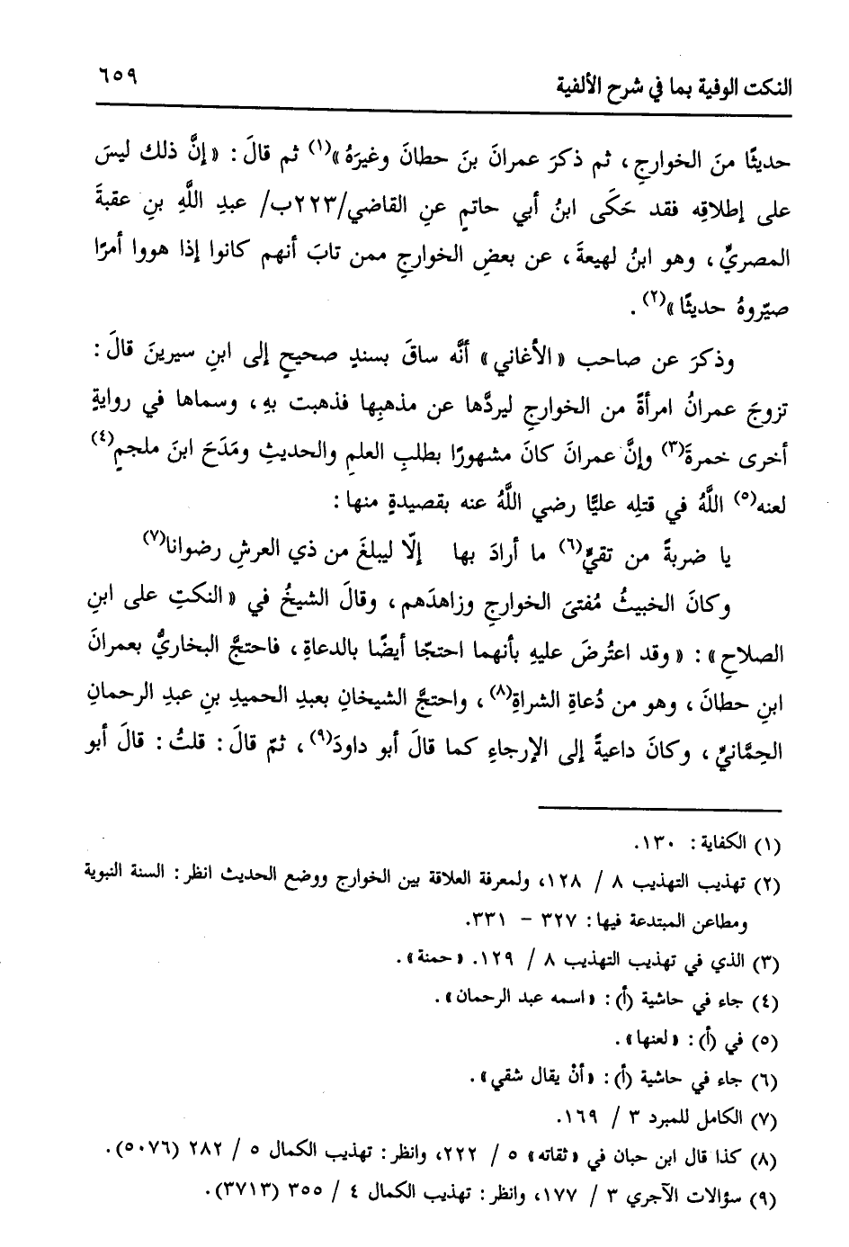 وذكرَ عنْ صاحب " الأغانيِّ " أنَّه ساقَ بسندٍ صحيحٍ إلى ابن سيرين قالَ: تزوجَ عمرانُ امرأةً من الخوارجِ ليردّها عنْ مذهبها فذهبت بهِ، وسماها في روايةٍ أخرى خمرة (¬3) وإنَّ عمرانَ كانَ مشهوراً بطلبِ العلمِ والحديثِ ومَدَحَ ابنَ ملجمٍ (¬4) لعنهُ (¬5) اللهُ في قتلهِ علياً - رضي الله عنه - بقصيدةٍ منها: