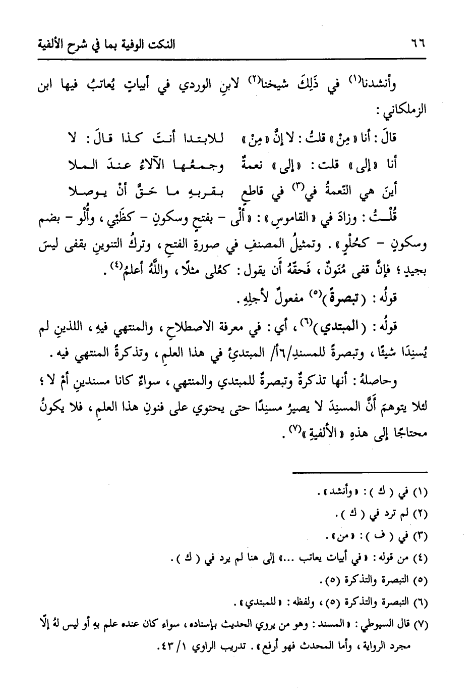 وحاصلهُ: أنها تذكرةٌ وتبصرةٌ للمبتدي والمنتهي، سواءٌ كانا مسندينِ أمْ لا؛ لئلا يتوهمَ أَنَّ المسنِدَ لا يصيرُ مسنِداً، حتى يحتوي على فنونِ هذا العلمِ، فلا يكونُ محتاجاً إلى هذهِ " الألفيةِ " (¬7).