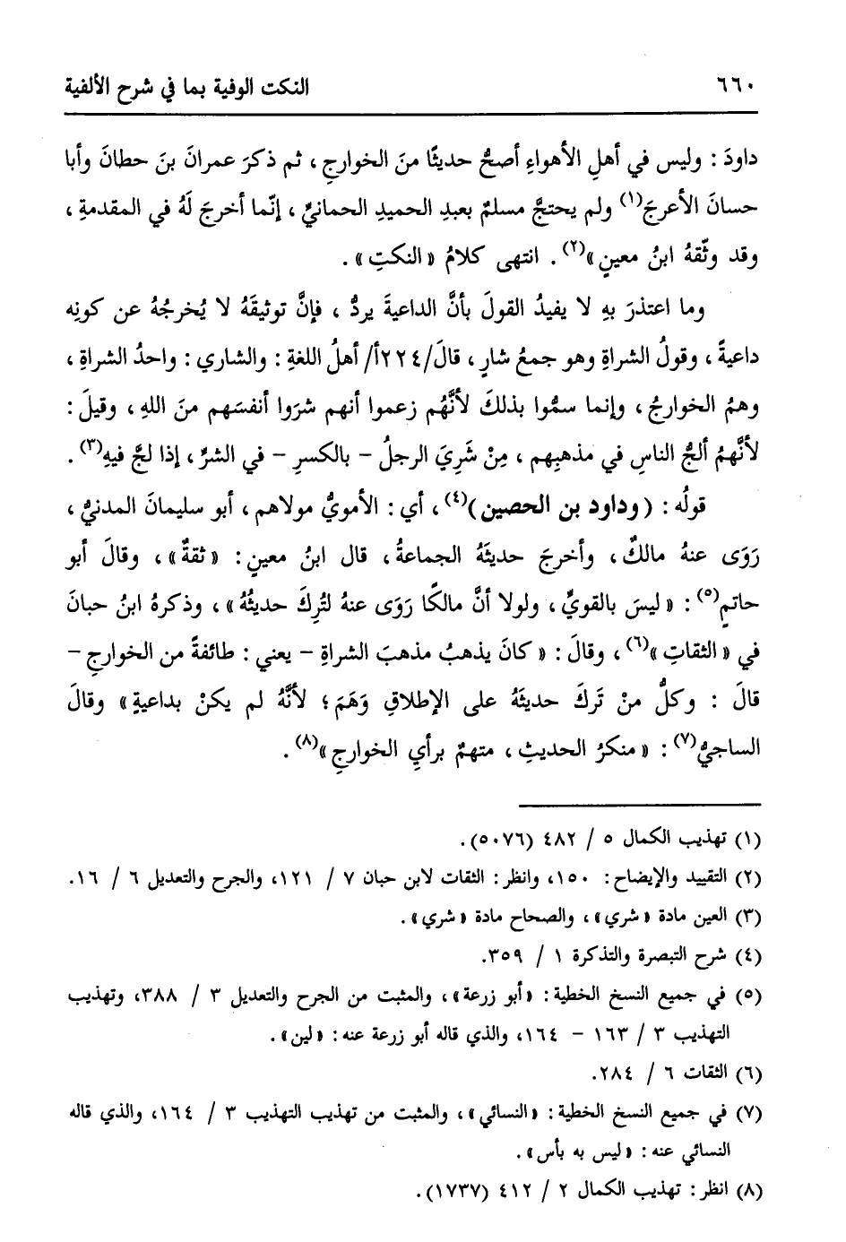 وليس في أهلِ الأهواءِ أصحُّ حديثاً منَ الخوارجِ، ثم ذكرَ عمرانَ بنَ حطانَ وأبا حسانَ الأعرج (¬1) ولم يحتجَّ مسلمٌ بعبدِ الحميدِ الحمانيِّ، إنّما أخرجَ لَهُ في المقدمةِ، وقدْ وثّقهُ ابنُ معينٍ)). (¬2) انتهى كلامُ " النكتِ ".