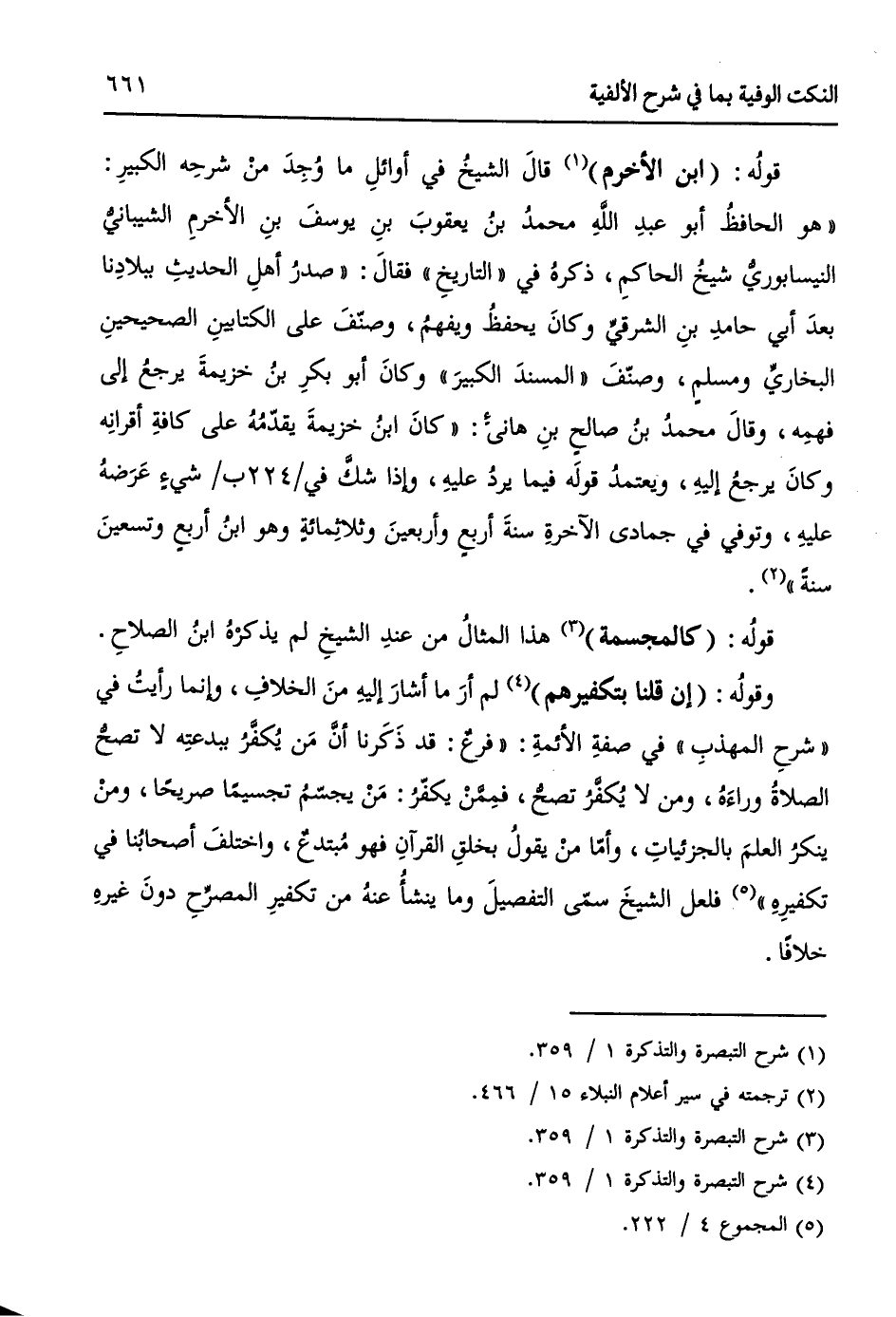 قولهُ: (ابن الأخرم) (¬1) قالَ الشيخُ في أوائلِ ما وُجِدَ منْ شرحهِ الكبيرِ: ((هو الحافظُ أبو عبد اللهِ محمدُ بنُ يعقوبَ بنِ يوسفَ بنِ الأخرم الشيبانيُّ النيسابوريُّ شيخُ الحاكمِ، ذكرهُ في " التاريخِ " فقالَ: ((صدرُ أهلِ الحديثِ ببلادِنا بعدَ أبي حامدِ بنِ الشرقي وكانَ يحفظُ ويفهمُ، وصنّفَ على الكتابينِ الصحيحينِ البخاريِّ ومسلمٍ، وصنّفَ "المسندَ الكبيرَ" وكانَ أبو بكرِ بنُ خزيمةَ يرجعُ إلى فهمهِ، وقالَ محمدُ بنُ صالحٍ بنِ هانئ: ((كانَ ابنُ خزيمةَ يقدّمُهُ على كافةِ أقرانهِ وكانَ يرجعُ إليهِ، ويعتمدُ قولهُ فيما يرد عليهِ، وإذا شكَّ في /224 ب/ شيءٍ عَرَضهُ عليهِ، وتوفي في جمادى الآخرةِ سنةَ أربعٍ وأربعينَ وثلاثِ مئةٍ وهو ابنُ أربعٍ وتسعينَ سنةً)) (¬2).