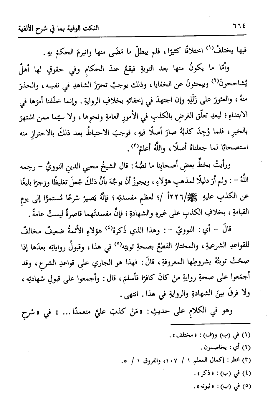 ورأيتُ بخطِّ بعضِ أصحابنا ما نصّهُ: قال الشيخُ محيي الدين النوويُّ - رحمه الله -: ولم أرَ دليلاً لمذهبِ هؤلاءِ، ويجوزُ أنْ يوجهَ بأنَّ ذلكَ جُعلَ تغليظاً وزجراً بليغاً عن الكذبِ عليهِ - صلى الله عليه وسلم - /226أ /؛ لعظمِ مفسدتهِ؛ فإنَّهُ يَصيرُ شرعاً مُستمراً إلى يومِ القيامةِ، بخلافِ الكذبِ على غيرهِ والشهادةِ؛ فإنَّ مفسدتهما قاصرةٌ ليستْ عامةً.