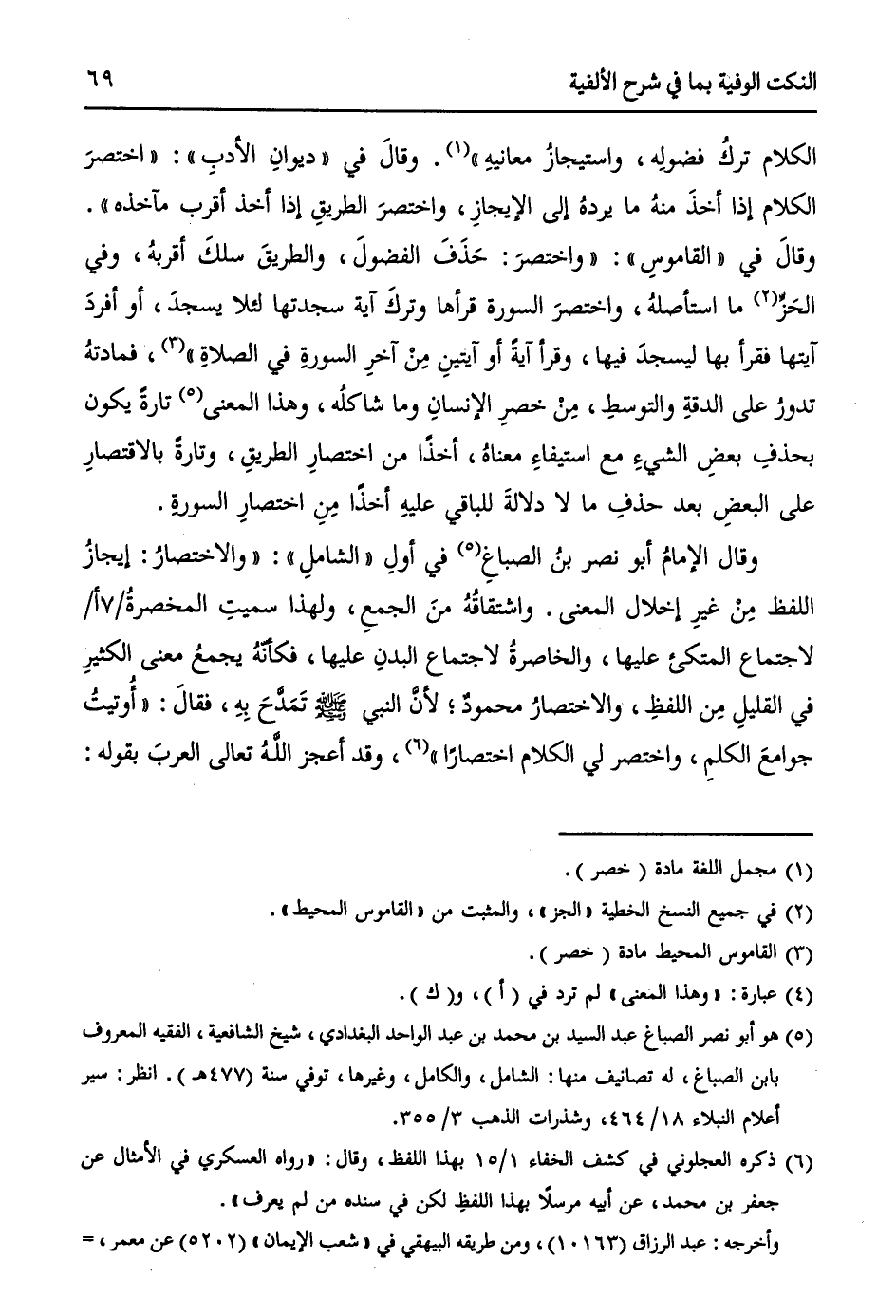 وقالَ الإمامُ أبو نصر بنُ الصباغِ (¬5) في أولِ " الشاملِ ": ((والاختصارُ: إيجازُ اللفظ مِنْ غيرِ إخلال المعنى. واشتقاقُهُ منَ الجمعِ، ولهذا سميتِ المخصرةُ /7أ/ لاجتماعِ المتكيءِ عليها، والخاصرةُ لاجتماع البدنِ عليها، فكأنّهُ يجمعُ معنى الكثيرِ في القليلِ مِن اللفظِ، والاختصارُ محمودٌ؛ لأنَّ النبي - صلى الله عليه وسلم - تَمَدَّحَ بِهِ، فقالَ: ((أُوتيتُ جوامعَ الكلمِ، واختصر لي الكلام اختصاراً)) (¬6)، وقد أعجزَ اللهُ تعالى العربَ بقولهِ: