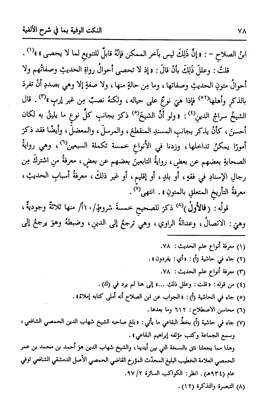 قلتُ: وعللَ ذَلِكَ بأنْ قالَ: ((إذ لا تحصى أحوالُ رواةِ الحديثِ وصفاتُهم ولا أحوالُ متونِ الحديثِ وصفاتها، وما مِنْ حالةٍ منها، ولا صفةٍ إلا وهي بصددِ أنْ تفردَ بالذكرِ وأهلها (¬2) فإذا هيَ نوعٌ على حياله، ولكنهُ نصبٌ مِنْ غير إربٍ)) (¬3). قالَ الشيخُ سراجُ الدينِ (¬4): ((ولو أَنَّ الشيخَ (¬5) ذكرَ بجانبِ كلِ نوعٍ ما يليقُ بهِ لكانَ أحسنَ، كأنْ يذكر بجانبِ المسندِ المنقطعَ، والمرسلَ، والمعضلَ، وأيضاً فقدْ ذكرَ أموراً يمكنُ تداخلها، وزدنا في الأنواعِ خمسة تكملة السبعين (¬6)، وهي روايةُ الصحابةِ بعضهم عنْ بعضٍ، روايةُ التابعينَ بعضهم عن بعضٍ، معرفةُ منِ اشتركَ مِنْ رجالِ الإسنادِ في فقهٍ، أو بلدٍ، أو إقليمٍ، أو غير ذلكَ، معرفةُ أسبابِ الحديثِ، معرفةُ التأريخِ المتعلقِ بالمتونِ)). انتهى (¬7).