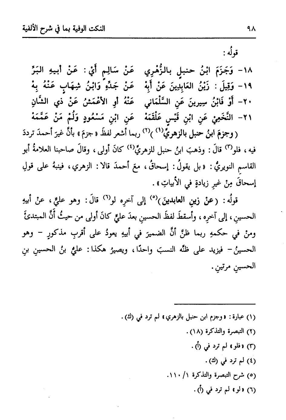 (وجزمَ ابنُ حنبل بالزهريِّ (¬1)) (¬2) ربما أشعر لفظَ ((جزمَ)) بأنَّ غيرَ أحمدَ ترددَ فيهِ، فلو (¬3) قالَ: وذهبَ ابنُ حنبل للزهريِّ (¬4) كانَ أولى، وقالَ صاحبنا العلامةُ أبو القاسمِ النويريُّ: ((بل يقولُ: إسحاقُ، معَ أحمدَ قالا: الزهري، فينبهُ على قولِ إسحاقَ مِنْ غيرِ زيادةٍ في الأبياتِ)).
