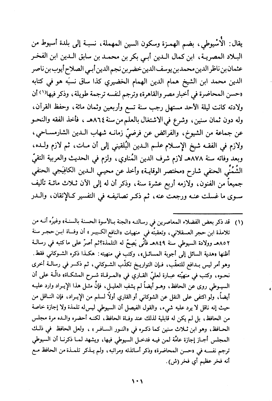 يقال: الأُسيوطي، بضم الهمزة وسكون السين المهملة، نسبة إلى بلدة أسيوط من البلاد المصرية، ابن كمال الدين أبي بكر بن محمد بن سابق الدين بن الفخر عثمان بن ناظر الدين محمج بن يوسف الدين خضر بن نجم الدين أبي الصلاح أيوب بن ناصر الدين محمد ابن الشيخ همام الدين الهمام الخضيري كذا ساق نسبة هو في كتابه "حسن المحاضرة في أخبار مصر والقاهرة" وترجم لنفسه ترجمة طويلة، وذكر فيها (قد ذكر بعض الفضلاء المعاصرين في رسالته "الجنة بالأسوة الحسنة بالسنة" وغيرُه أنه من تلامذة ابن حجر العسقلاني، وتعقبتُه في منهيات "النافع الكبير" أن وفاة ابن حجر سنة 852 هـ وولادة السيوطي سنة 849 هـ فأنَّى يَصِحّ له التلمذة؟ ثم أصرّ على ما كتبه في رسالة أظنها "هدية السائل إلى أجوبة المسائل"، وكتب في منهيته: هكذا ذكره الشوكاني فقط. وهو أمر ليس بدافع للتعقّب، فإن التواريخ تكذّب الشوكاني، ثم ذكر في رسالة أخرى نحوه، وكتب في منهيّته عبارة لعلّي القاري في "المرقاة شرح المشكاة" دالّة على أن السيوطي روى عن الحافظ، وهو أيضاً لم يشفِ العليل، فإنَّ مثل هذا الإيراد وارد عليه أيضاً، ولو اكتفى على النقل عن الشوكاني أو القاري أولاً لسلم من الإيراد، فإن الناقل من حيث إنه ناقل لا يرد عليه شيء، والقول الفيصل أن السيوطي ليس له تلامذة ولا إجازة خاصة من الحافظ، بل لم يكن له قابلية لذلك عند وفاة الحافظ، لكنه أحضره والده مرة مجلس الحافظ، وهو ابن ثلاث سنين كما ذكره في "النور السافر"، ولعل الحافظ في ذلك المجلس أجاز إجازة عامَّة لمن فيه فدخل السيوطي فيها، ويشهد لما ذكرنا أن السيوطي ترجم نفسه في "حسن المحاضرة" وذكر أساتذته ومراتبه، ولم يذكر تلمذة من الحافظ مع أنه فخر عظيم أي فخر (ش)) أن ولادته كانت ليلة الأحد مستهل رجب سنة تسع وأربعين وثمان مائة، وحفظ القرآن، وله دون ثمان سنين، وشرع في الاشتغال بالعلم من سنة 864 هـ، فأخذ الفقه والنحو عن جماعة من الشيوخ، والفرائض عن فرضيّ زمانه شهاب الدين الشارمساحي، ولازم في الفقه شيخ الإسلام علم الدين البُلقيني إلى أن مات، ثم لازم ولده، وبعد وفاته سنة 878 هـ لازم شرف الدين المُناوي، ولزم في الحديث والعربية التقيّ الشُمُنِّي الحنفي شارح "مختصر الوقاية" وأخذ عن محيي الدين الكافِيَجي الحنفي جميعاً من الفنون، ولازمه أربع عشرة سنة، وذكر أن له إلى الآن ثلاث مائة تأليف سوى ما غسلت عنه ورجعت عنه، ثم ذكر تصانيفه في التفسير كالإتقان، والدر