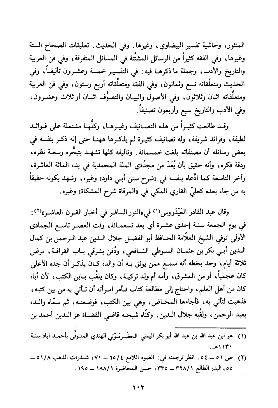 المنثور، وحاشية تفسير البيضاوي، وغيرها. وفي الحديث تعليقات الصحاح الستة وغيرها، وفي الفقه كثيراً من الرسائل المشتَّتة في المسائل المتفرقة، وفي فن العربية والتاريخ والأدب، وجملة ما ذكرها فيه: في التفسير خمسة وعشرون تأليفاً، وفي الحديث ومتعلَّقاته تسع وثمانون، وفي الفقه ومتعلَّقاته أربع وستون، وفي فن العربية ومتعلَّقاته اثنان وثلاثون، وفي الأصول والبيان والتصوُّف اثنان أو ثلاث وعشرون، وفي الأدب والتاريخ سبع وأربعون تصنيفاً. وقد طالعت كثيراً من هذه التصانيف وغيرها، وكلُّها مشتملة على فوائد لطيفة، وفرائد شريفة، وله تصانيف كثيرة لم يذكرها ههنا حتى إنه ذكر بنفسه في بعض رسائله أن مصنفاته بلغت خمسمائة. وتآليفه كلها تشهد بتبحُّره وسعة نظره، ودقة فكره، وأنه حقيق بأن يُعَدّ من مجدِّدي الملة المحمدية في بدء المائة العاشرة، وآخر التاسعة كما ادَّعاه بنفسه في "شرح سنن أبي داود" وغيره، وشهد بكونه حقيقاً به من جاء بعده كعليّ القاري المكي في "المرقاة شرح المشكاة" وغيره.