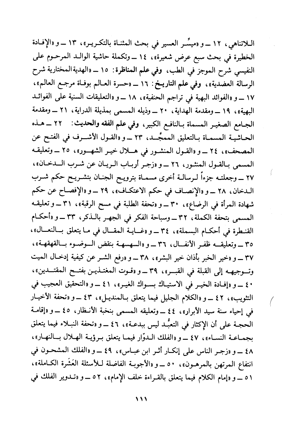 اللاتناهي، 12 - و "ميسِّر العسير في بحث المثناة بالتكرير"، 13 - و "الإِفادة الخطيرة في بحث سبع عرض شعيرة"، 14 - وتكملة حاشية الوالد المرحوم على النفيسي شرح الموجز في الطب، وفي علم المناظرة: 15 - "الهدية المختارية شرح الرسالة العضدية"، وفي علم التاريخ: 16 - "حسرة العالم بوفاة مرجع العالم"، 17 - و "الفوائد البهية في تراجم الحنفية"، 18 - و"التعليقات السنية على الفوائد البهية"، 19 - ومقدمة الهداية، 20 - وذيله المسمى بمذيلة الدراية، 21 - ومقدمة الجامع الصغير المسماة بالنافع الكبير، وفي علم الفقه والحديث: 22 - هذه الحاشية المسماة بالتعليق الممجَّد، 23 - و "القول الأشرف في الفتح عن المصحف"، 24 - و "القول المنشور في هلال خير الشهور"، 25 - وتعليقه المسمى بالقول المنثور، 26 - و "زجر أرباب الريان عن شرب الدخان"، 27 - وجعلته جزءاً لرسالة أخرى مسماة بترويح الجنان بتشريح حكم شرب الدخان، 28 - و"الإِنصاف في حكم الاعتكاف"، 29 - و "الإِفصاح عن حكم شهادة المرأة في الرضاع"، 30 - و "تحفة الطلبة في مسح الرقبة"، 31 - وتعليقه المسمى بتحفة الكملة، 32 - وسباحة الفكر في الجهر بالذكر، 33 - و"أحكام القنطرة في أحكام البسملة"، 34 - و "غاية المقال في ما يتعلق بالنعال"، 35 - وتعليقه ظفر الأنفال، 36 - و "السهسهة بنقض الوضوء بالقهقهة"، 37 - و"خير الخبر بأذان خير البشر"، 38 - و "رفع الشر عن كيفية إدخال الميت وتوجيهه إلى القبلة في القبر"، 39 - و "قوت المغتذين بفتح المقتدين"، 40 - و "إفادة الخير في الاستياك بسواك الغير"، 41 - و"التحقيق العجيب في التثويب"، 42 - و "الكلام الجليل فيما يتعلق بالمنديل"، 43 - و "تحفة الأخيار في إحياء سنة سيد الأبرار"، 44 - وتعليقه المسمى بنخبة الأنظار، 45 - و "إقامة الحجة على أن الإِكثار في التعبُّد ليس ببدعة"، 46 - و "تحفة النبلاء فيما يتعلق بجماعة النساء"، 47 - و"الفلك الدوّار فيما يتعلق برؤية الهلال بالنهار"، 48 - و "زجر الناس على إنكار أثر ابن عباس"، 49 - و "الفلك المشحون في انتفاع المرتهن بالمرهون"، 50 - و "الأجوبة الفاضلة للأسئلة العَشَرة الكاملة"، 51 - و"إمام الكلام فيما يتعلق بالقراءة خلف الإِمام"، 52 - و "تدوير الفلك في