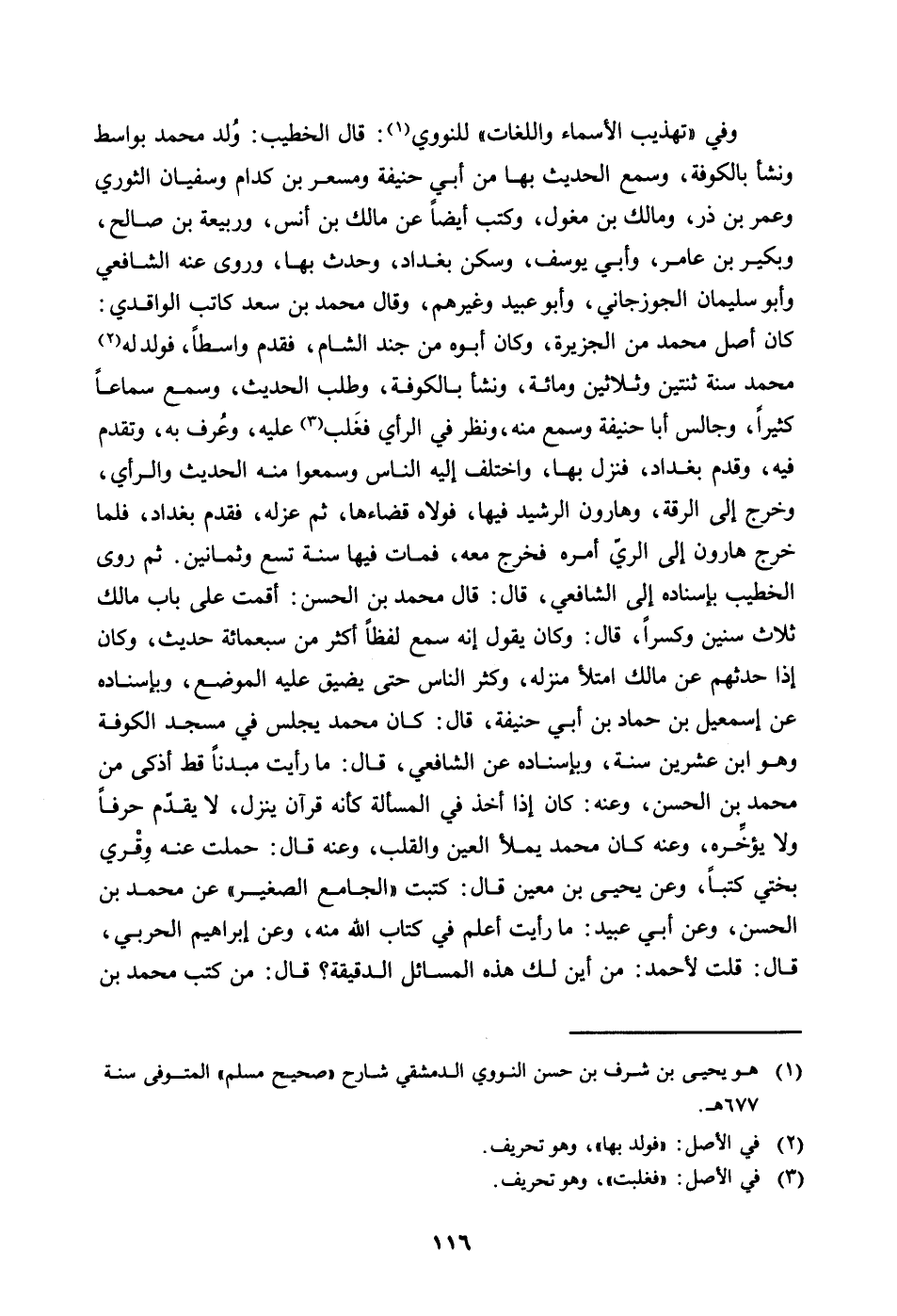 وفي "تهذيب الأسماء واللغات" للنووي (هو يحيى بن شرف بن حسن النووي الدمشقي شارح "صحيح مسلم" المتوفى سنة 677 هـ) : قال الخطيب: وُلد محمد بواسط ونشأ بالكوفة، وسمع الحديث بها من أبي حنيفة ومسعر بن كدام وسفيان الثوري وعمر بن ذر، ومالك بن مغول، وكتب أيضاً عن مالك بن أنس، وربيعة بن صالح، وبكير بن عامر، وأبي يوسف، وسكن بغداد، وحدث بها، وروى عنه الشافعي وأبو سليمان الجوزجاني، وأبو عبيد وغيرهم، وقال محمد بن سعد كاتب الواقدي: كان أصل محمد من الجزيرة، وكان أبوه من جند الشام، فقدم واسطاً، فولد له (في الأصل: "فولد بها"، وهو تحريف) محمد سنة ثنتين وثلاثين ومائة، ونشأ بالكوفة، وطلب الحديث، وسمع سماعاً كثيراً، وجالس أبا حنيفة وسمع منه، ونظر في الرأي فغَلب (في الأصل: "فغلبت"، وهو تحريف) عليه، وعُرف به، وتقدم فيه، وقدم بغداد، فنزل بها، واختلف إليه الناس وسمعوا منه الحديث والرأي، وخرج إلى الرقة، وهارون الرشيد فيها، فولاه قضاءها، ثم عزله، فقدم بغداد، فلما خرج هارون إلى الريّ أمره فخرج معه، فمات فيها سنة تسع وثمانين. ثم روى الخطيب بإسناده إلى الشافعي، قال: قال محمد بن الحسن: أقمت على باب مالك ثلاث سنين وكسراً، قال: وكان يقول إنه سمع لفظاً أكثر من سبعمائة حديث، وكان إذا حدثهم عن مالك امتلأ منزله، وكثر الناس حتى يضيق عليهم الموضع، وبإسناده عن إسماعيل بن حماد بن أبي حنيفة، قال: كان محمد يجلس في مسجد الكوفة وهو ابن عشرين سنة، وبإسناده عن الشافعي، قال: ما رأيت مبدناً قط أذكى من محمد بن الحسن، وعنه: كان إذا أخذ في المسألة كأنه قرآن ينزل، لا يقدّم حرفاً ولا يؤخِّره، وعنه كان محمد يملأ العين والقلب، وعنه قال: حملت عنه وِقْري بختي كتباً، وعن يحيى بن معين قال: كتبت "الجامع الصغير" عن محمد بن الحسن، وعن أبي عبيد: ما رأيت أعلم في كتاب الله منه، وعن إبراهيم الحربي، قال: قلت لأحمد: من أين لك هذه المسائل الدقيقة؟ قال: من كتب محمد بن