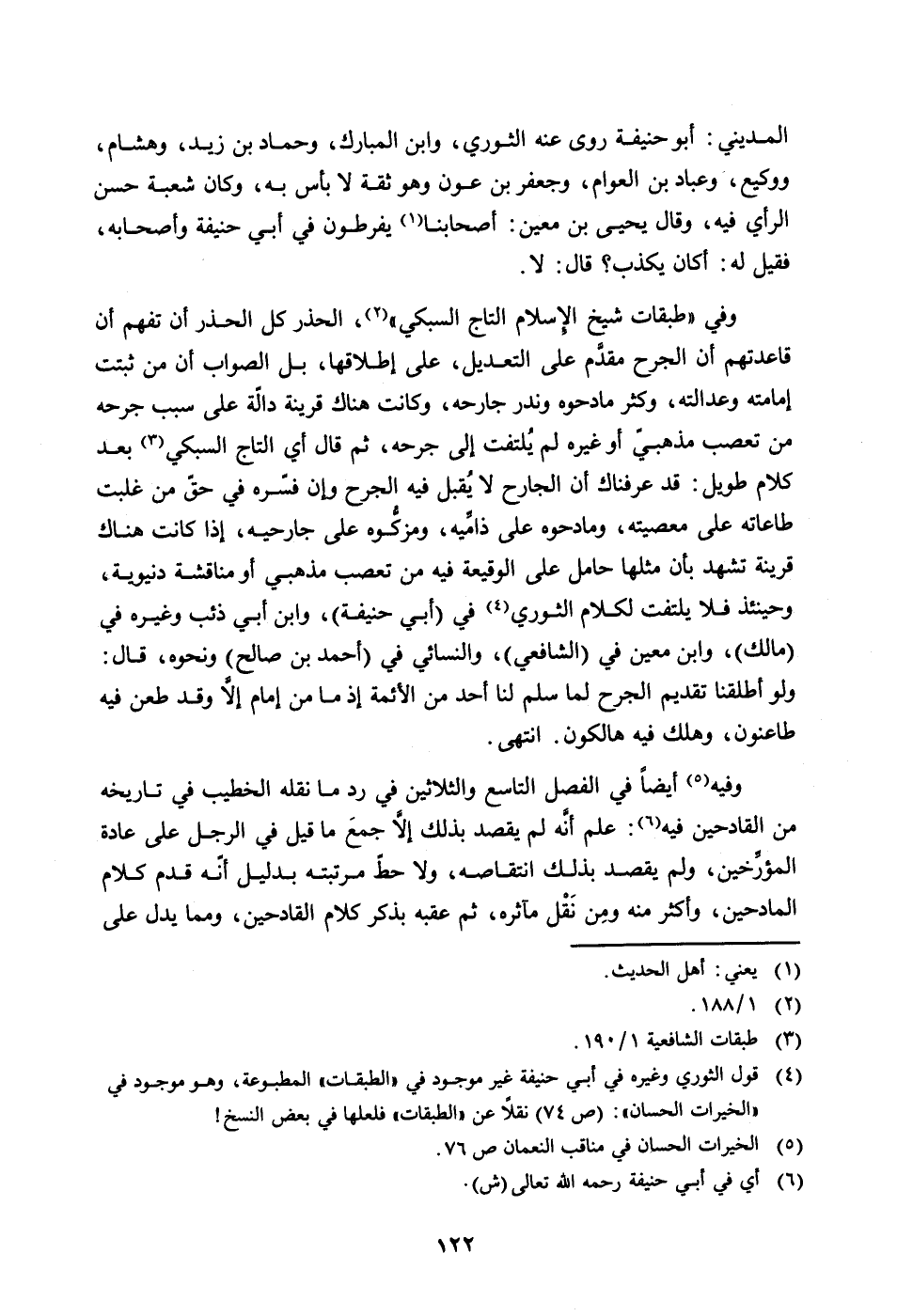 وفي "طبقات شيخ الإسلام التاج السبكي" (1/188) ، الحذر كل الحذر أن تفهم أن قاعدتهم أن الجرح مقدَّم على التعديل، على إطلاقها، بل الصواب أن من ثبتت إمامته وعدالته، وكثر مادحوه وندر جارحه، وكانت هناك قرينة دالّة على سبب جرحه من تعصب مذهبيّ أو غيره لم يُلتفت إلى جرحه، ثم قال أي التاج السبكي (طبقات الشافعية 1/190) بعد كلام طويل: قد عرفناك أن الجارح لا يُقبل فيه الجرح وإن فسّره في حقّ من غلبت طاعاته على معصيته، ومادحوه على ذامِّيه، ومزكُّوه على جارحيه، إذا كانت هناك قرينة تشهد بأن مثلها حامل على الوقيعة فيه من تعصب مذهبي أو مناقشة دنيوية، وحينئذ فلا يلتفت لكلام الثوري (قول الثوري وغيره في أبي حنيفة غير موجود في "الطبقات" المطبوعة، وهو موجود في "الخيرات الحسان": (ص 74) نقلاً عن "الطبقات" فلعلها في بعض النسخ!) في (أبو حنيفة) ، وابن أبي ذئب وغيره في (مالك) ، وابن معين في (الشافعي) ، والنسائي في (أحمد بن صالح) ونحوه، قال: ولو أطلقنا تقديم الجرح لما سلم لنا أحد من الأئمة إذ ما من إمام إلاَّ وقد طعن فيه طاعنون، وهلك فيه هالكون. انتهى.