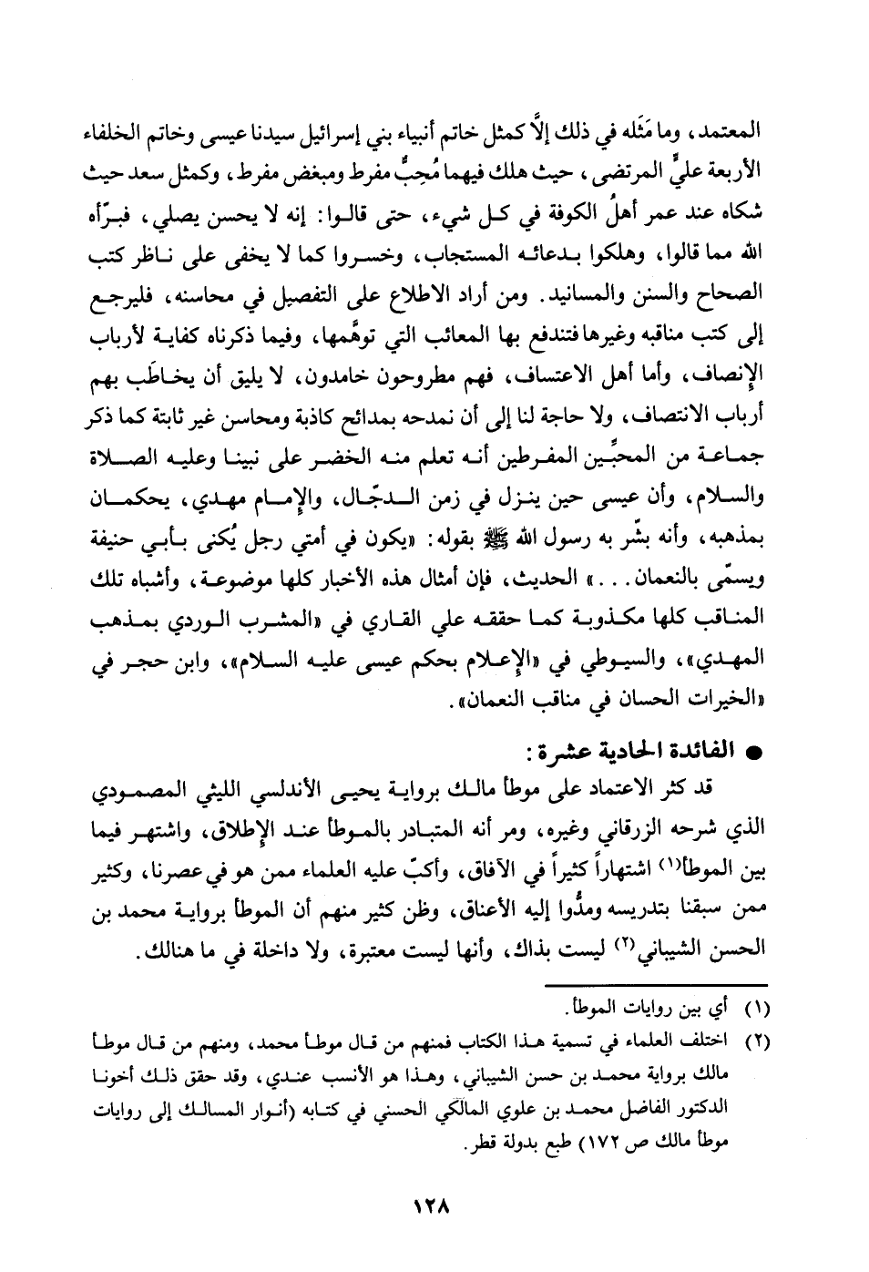 - قد كثر الاعتماد على موطأ مالك برواية يحيى الأندلسي الليثي المصمودي الذي شرحه الزرقاني وغيره، ومر أنه المتبادر بالموطأ عند الإِطلاق، واشتهر فيما بين الموطأ (أي بين روايات الموطأ) اشتهاراً كثيراً في الآفاق، وأكبّ عليه العلماء ممن هو في عصرنا، وكثير ممن سبقنا بتدريسه ومدُّوا إليه الأعناق، وظن كثير منهم أن الموطأ برواية محمد بن الحسن الشيباني (اختلف العلماء في تسمية هذا الكتاب فمنهم من قال موطأ محمد، ومنهم من قال موطأ مالك برواية محمد بن حسن الشيباني، وهذا هو الأنسب عندي، وقد حقق ذلك أخونا الدكتور الفاضل محمد بن علوي المالكي الحسني في كتابه "أنوار المسالك إلى روايات موطأ مالك ص 172" طبع بدولة قطر) ليست بذاك، وأنها ليست معتبرة، ولا داخلة في ما هنالك.