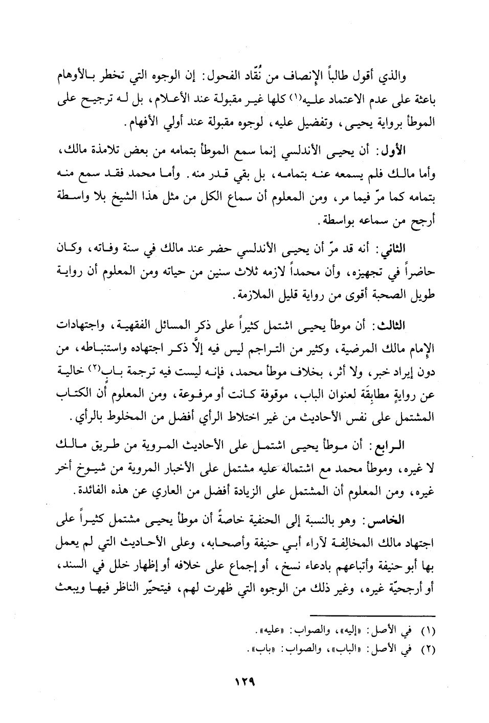 والذي أقول طالباً الإنصاف من نقاد الفحول: أن الوجوه التي تخطر بالأوهام باعثة على عدم الاعتماد عليه (في الأصل: "إليه"، والصواب: "عليه") كلها غير مقبولة عند الأعلام، بل له ترجيح على الموطّأ برواية يحيى، وتفضيل علية، لوجوه مقبولة عند أولي الإفهام.