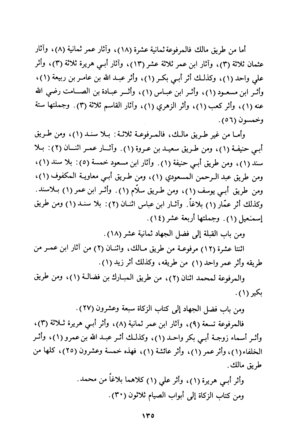 وأما من غير طريق مالك، فالمرفوعة ثلاثة: بلا سند (1) ، ومن طريق أبي حنيفة (1) ، ومن طريق سعيد بن عروة (1) ، وآثار عمر اثنان (2) : بلا سند (1) ، ومن طريق أبي حنيفة (1) ، وآثار ابن مسعود خمسة (5) : بلا سند (1) ، ومن طريق عبد الرحمن المسعودي (1) ، ومن طريق أبي معاوية المكفوف (1) ، ومن طريق أبي يوسف (1) ، ومن طريق سلاّم (1) . وأثر ابن عمر (1) بلا سند. وكذلك أثر عمّار (1) بلاغاً. وأثار ابن عباس اثنان (2) : بلا سند (1) ومن طريق اسماعيل (1) . وجملتها أربعة عشر (14) .