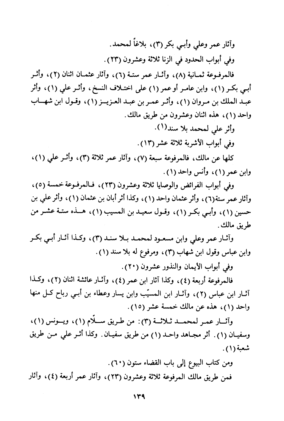 وفي أبواب الفرائض والوصايا ثلاثة وعشرون (23) ، فالمرفوعة خمسة (5) ، وآثار عمر ستة (6) ، وأثر عثمان واحد (1) ، وكذا أثر أبان بن عثمان (1) ، وأثر علي بن حسين (1) ، وأبي بكر (1) ، وقول سعيد بن المسيّب (1) ، هذه ستة عشر من طريق مالك.