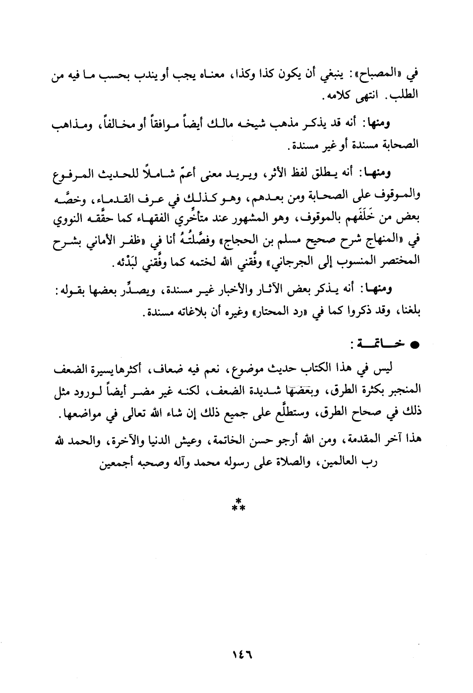 ومنها: أنه يطلق لفظ الأثر، ويريد معنى أعم شاملاً للحديث المرفوع والموقوف على الصحابة ومن بعدهم، وهو كذلك في عرف القدماء، وخصه بعض من خلفهم بالموقوف، وهو مشهور عند متأخري الفقهاء كما حقّقه النووي في "المنهاج شرح صحيح مسلم بن الحجاج" وفصَّلته أنا في "ظفر الأماني بشرح المختصر المنسوب إلى الجرجاني" وفّقني الله لختمته كما وفّقني لبدئه.