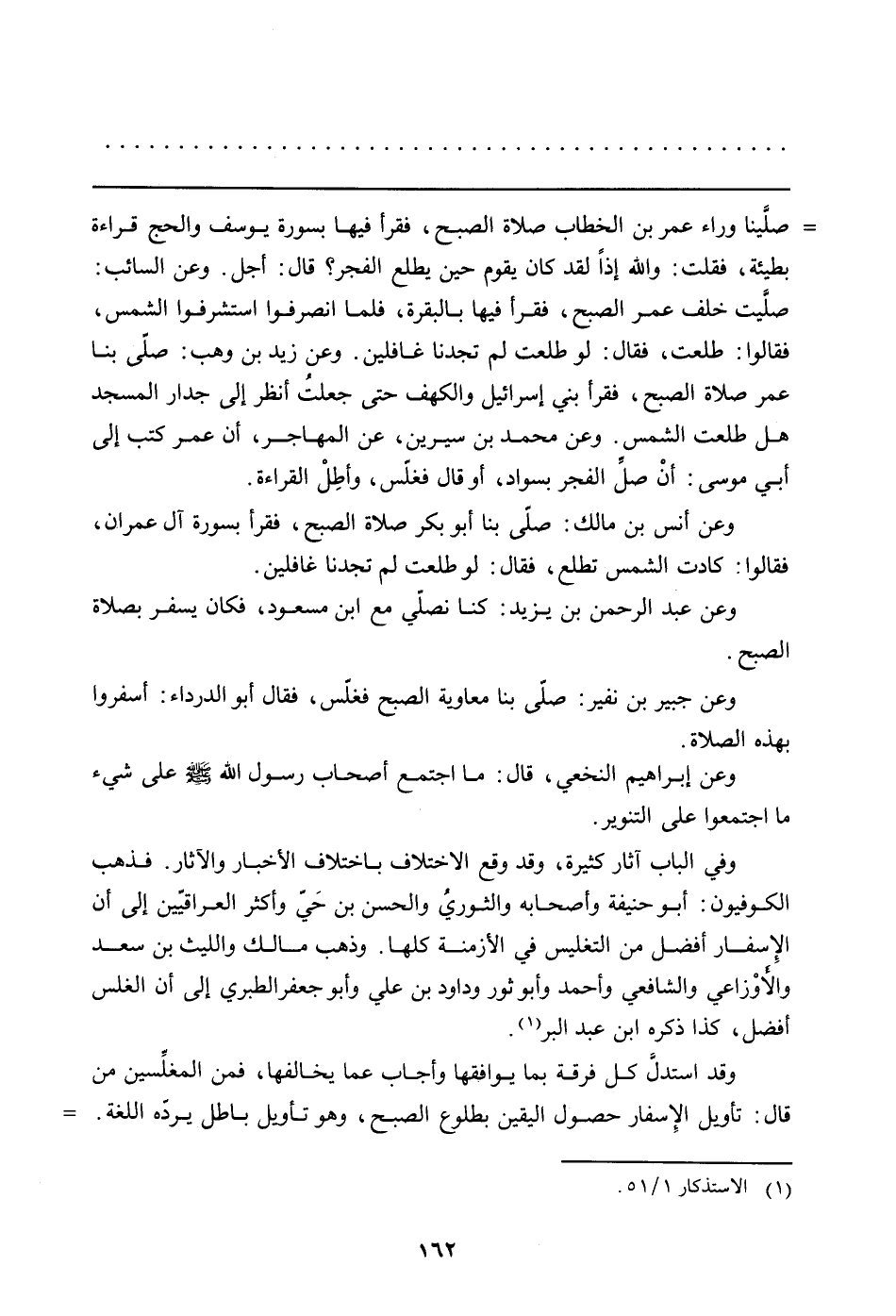 = صلينا وراء عمر بن الخطاب صلاة الصبح، فقرأ فيها بسورة يوسف والحج قراءة بطيئة فقلت: والله إذاً لقد كان يقوم حين يطلع الفجر؟ قال: أجل. وعن السائب: صلَّيت خلف عمر الصبح، فقرأ فيها بالبقرة، فلما انصرفوا استشرفوا الشمس، فقالوا: طلعت، فقال: لو طلعت لم تجدنا غافلين. وعن زيد بن وهب: صلى بنا عمر صلاة الصبح، فقرأ بني إسرائيل والكهف حتى جعلتُ أنظر إلى جدار المسجد هل طلعت الشمس. وعن محمد بن سيرين، عن المهاجر، أن عمر كتب إلى أبي موسى: أن صلِّ الفجر بسواد، أو قال فغلّس، وأطِل القراءة.