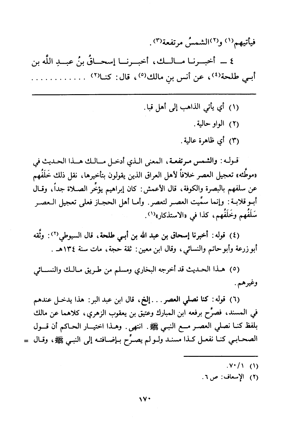 (¬4) قوله: أخبرنا إسحاق بن عبد الله بن أبي طلحة، قال السيوطي (الإسعاف: ص 6) : وثَّقه أبو زرعة وأبو حاتم والنسائي، وقال ابن معين: ثقة حجة، مات سنة 134 هـ.