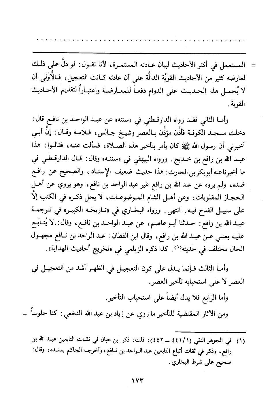 وأما الثاني فقد رواه الدارقطني في "سننه" عن عبد الواحد بن نافع قال: دخلت مسجد الكوفة فأذَّن مؤذَّن بالعصر وشيخ جالس، فلامه وقال: إنَّ أبي أخبرني أن رسول الله صلى الله عليه وسلم كان يأمر بتأخير هذه الصلاة، فسألت عنه، فقالوا: هذا عبد الله بن رافع بن خديج. ورواه البيهقي في "سننه" وقال: قال الدارقطني في ما أخبرنا عنه أبو بكر بن الحارث: هذا حديث ضعيف الإسناد، والصحيح عن رافع ضده، ولم يروه عن عبد الله بن رافع غير عبد الواحد بن نافع، وهو يروي عن أهل الحجاز المقلوبات، وعن أهل الشام الموضوعات، لا يحل ذكره في الكتب إلاَّ على سبيل القدح فيه. انتهى. ورواه البخاري في "تاريخه الكبير" في ترجمة عبد الله بن رافع: حدثنا أبو عاصم، عن عبد الواحد بن نافع، وقال..لا يُتابَع عليه يعني عن عبد الله بن رافع، وقال ابن القطان: عبد الواحد بن نافع مجهول الحال مختلف في حديثه (في الجوهر النقي (1/441 - 442) : قلت: ذكر ابن حبان في ثقات التابعين عبد الله بن رافع، وذكر في ثقات أتباع التابعين عبد الواحد بن نافع، وأخرجه الحاكم بسنده، وقال: صحيح على شرط البخاري) . كذا ذكره الزيلعي في "تخريج أحاديث الهداية".