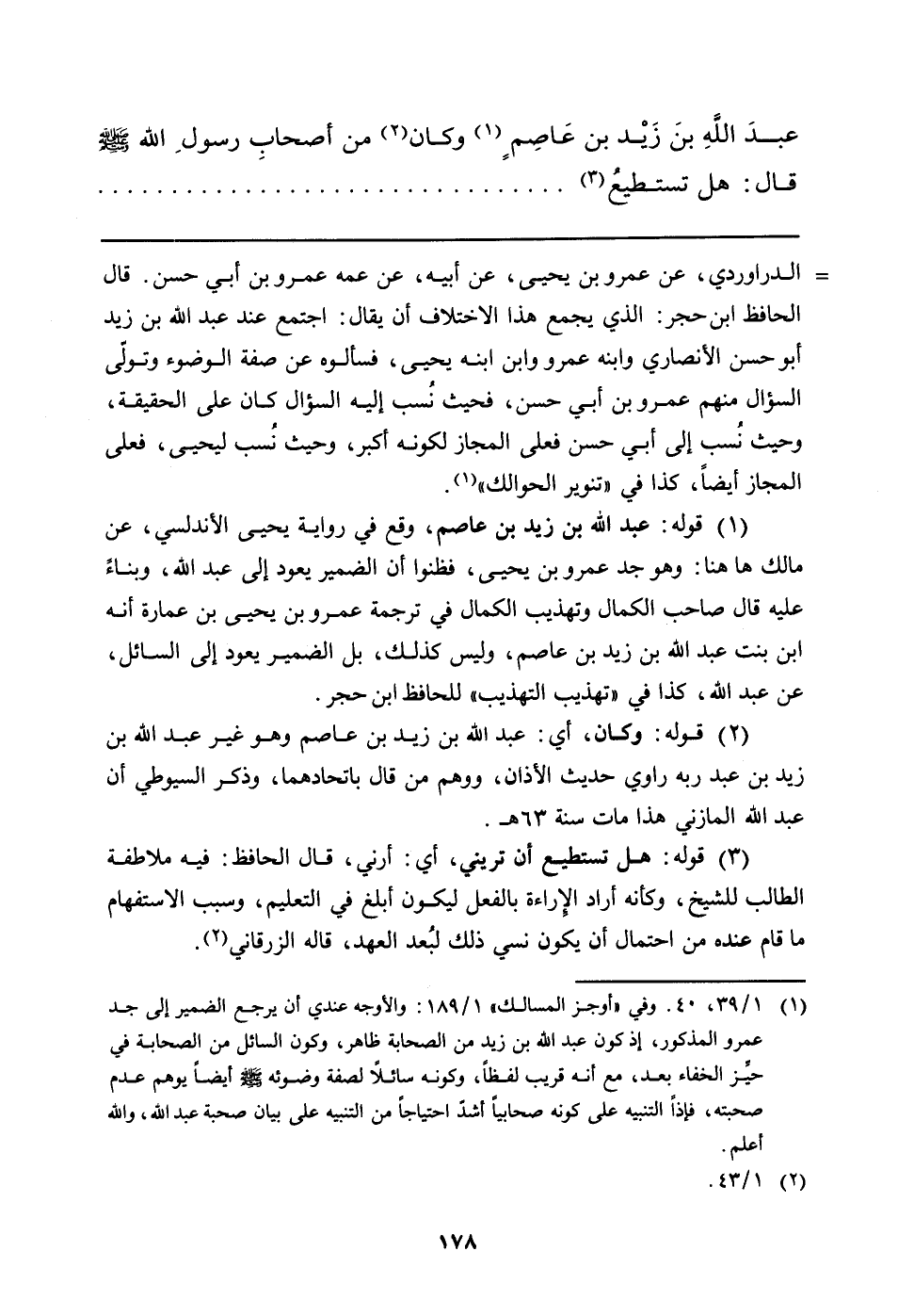 عبدَ اللَّهِ بنَ زَيْد بْنِ عَاصِمٍ (¬1) وَكَانَ (¬2) مِنْ أصحابِ رسولِ اللَّه صَلَّى اللَّهُ عَلَيْهِ وسلم قال: هل تستطيعُ (¬3)