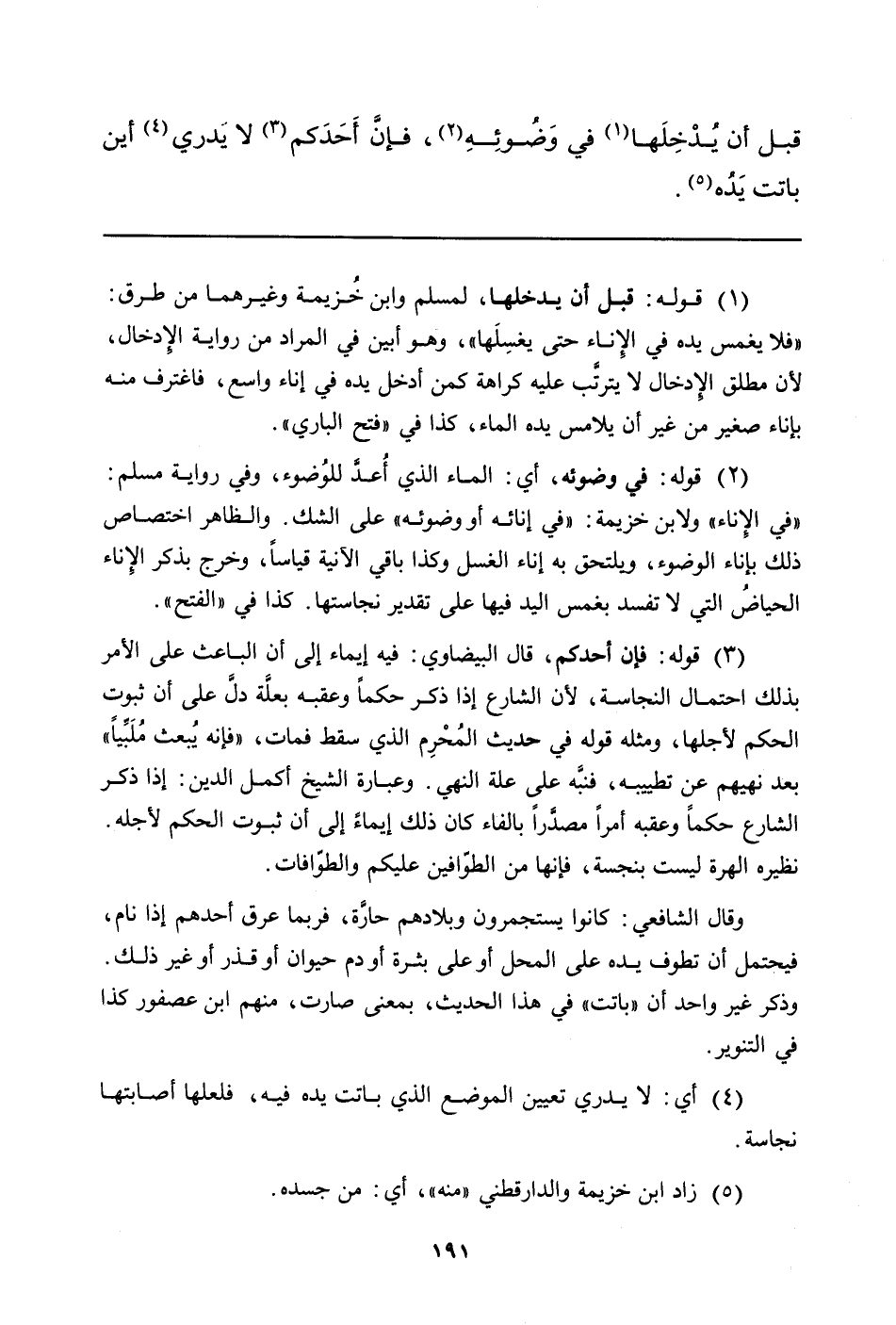 وقال الشافعي: كانوا يستجمرون وبلارهم حارَّة، فربما عرق أحدهم إذا نام، فيحتمل أن تطوف يده على المحل أو على بثرة أو دم حيوان أو قذر أو غير ذلك. وذكر غير واحد أن "باتت" في هذا الحديث، بمعنى صارت، منهم ابن عصفور كذا في التنوير.