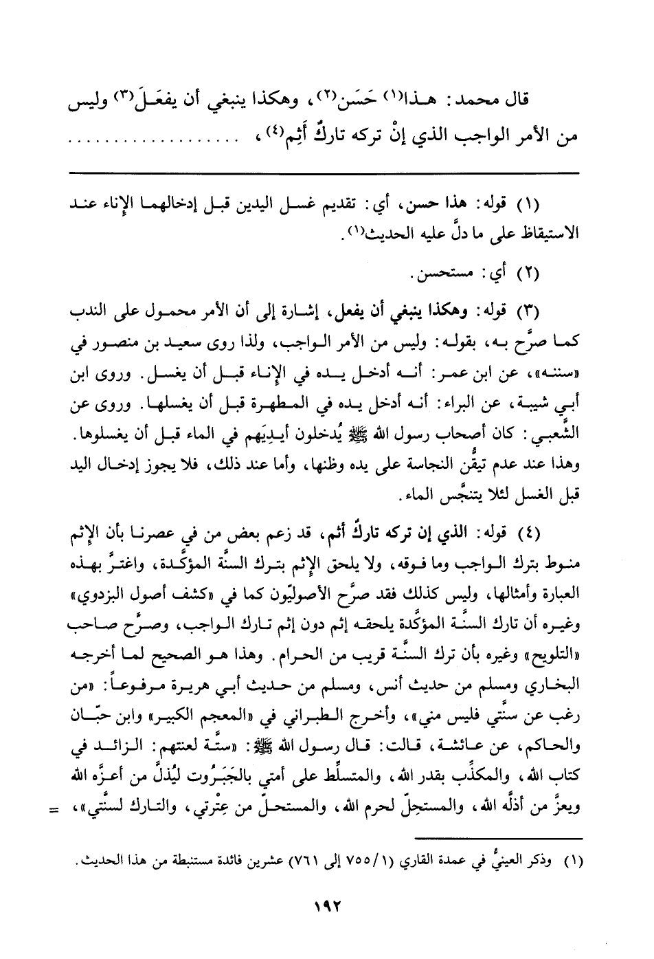 (¬4) قوله: الذي إن تركه تاركٌ أثم، قد زعم بعض من في عصرنا بأن الإثم منوط بترك الواجب وما فوقه، ولا يلحق الإثم بترك السنَّة المؤكَّدة، واغترَّ بهذه العبارة وأمثالها، وليس كذلك فقد صرَّح الأصوليّون كما في "كشف أصول البزدوي" وغيره أن تارك السنَّة المؤكَّدة يلحقه إثم دون إثم تارك الواجب، وصرَّح صاحب "التلويح" وغيره بأن ترك السنَّة قريب من الحرام. وهذا هو الصحيح لما أخرجه البخاري ومسلم من حديث أنس، ومسلم من حديث أبي هريرة مرفوعاً: "من رغب عن سنَّتي فليس مني"، وأخرج الطبراني في "المعجم الكبير" وابن حبّان والحاكم، عن عائشة، قالت: قال رسول الله صلى الله عليه وسلم: "ستَّة لعنتهم: الزائد في كتاب الله، والمكذب بقدر الله، والمتسلِّط على أمتي بالجَبَرُوت ليُذلَّ من أعزَّه الله ويعزَّ من أذلَّه الله، والمستحِلّ لحرم الله، والمستحلّ من عِترتي، والتارك لسنَّتي"، =