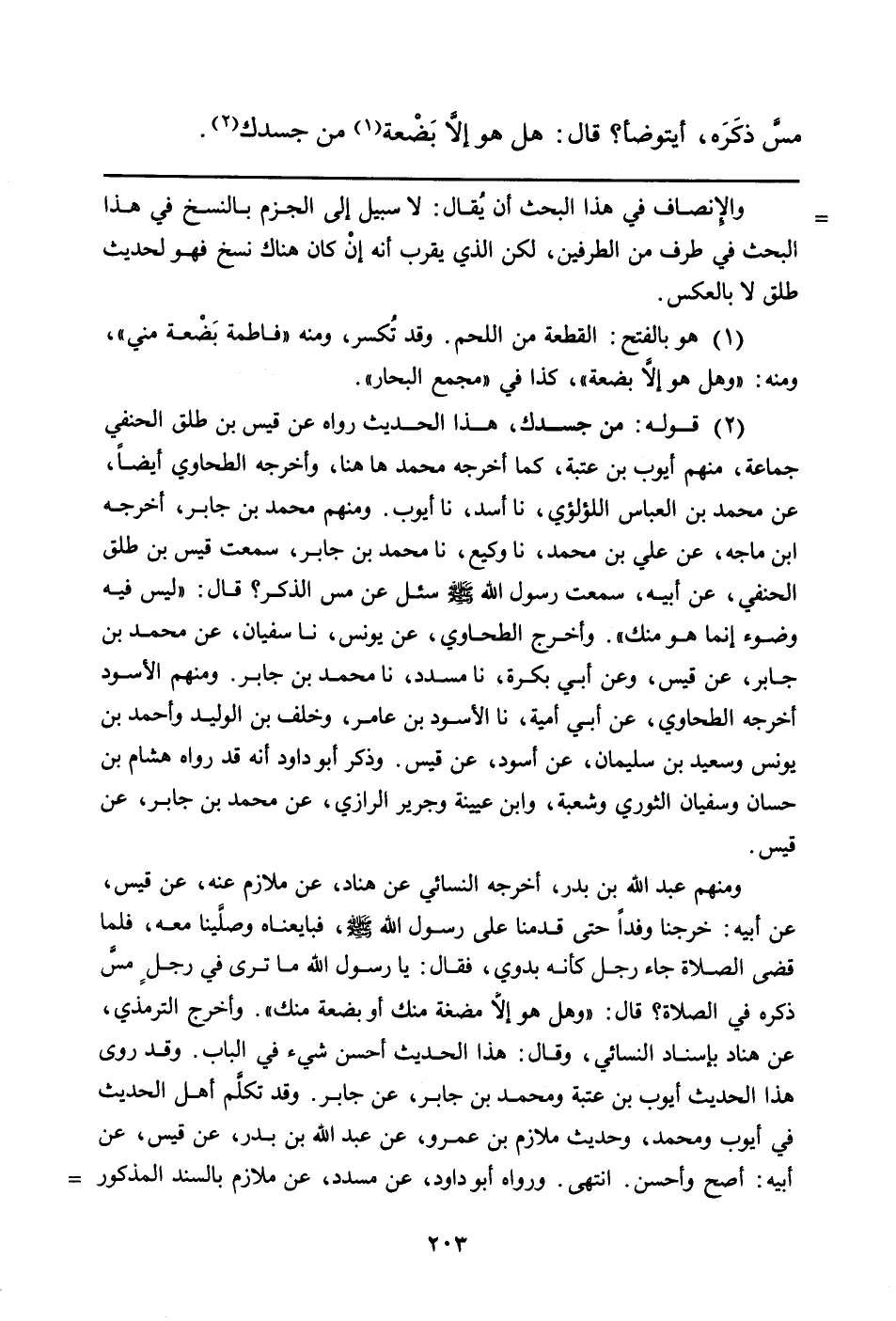 مسَّ ذَكَرَه، أَيَتَوَضَّأُ؟ قَالَ: هَلْ هُوَ إِلا بَضْعة (¬1) من جسدك (¬2) .