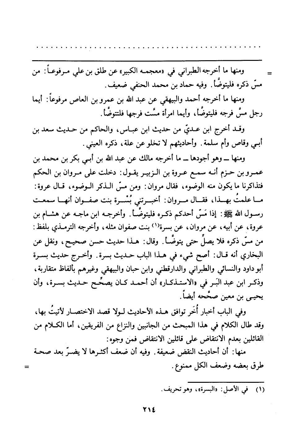 ومنها - وهو أجودها - ما أخرجه مالك عن عبد الله بن أبي بكر بن محمد بن عمرو بن حزم أنه سمع عروة بن الزبير يقول: دخلت على مروان بن الحكم فتذاكرنا ما يكون منه الوضوء، فقال مروان: ومن مسّ الذكر الوضوء، قال عروة " ما علمتُ بهذا، فقال مروان: أخبرتني بُسْرة بنت صفوان أنها سمعت رسول الله صلى الله عليه وسلم: إذا مَسّ أحدكم ذكره فليتوضأ. وأخرجه ابن ماجة عن هشام بن عروة، عن أبيه، عن مروان، عن بسرة (في الأصل: "البسرة" وهو تحريف) بنت صفوان مثله، وأخرجه الترمذي بلفظ: من مسّ ذكره فلا يصل حتى يتوضأ. وقال هذا حديث حسن صحيح، ونقل عن البخاري أنه قال: أصح شيء في هذا الباب حديث بسرة. وأخرج حديث بسرة أبو داود والنسائي والطبراني والدارقطني وابن حبان والبيهقي وغيرهم بألفاظ متقاربة، وذكر ابن عبد البر في "الاستذكار" أن أحمد كان يصحح حديث بسرة، وأن يحيى بن معين صححه أيضاً.