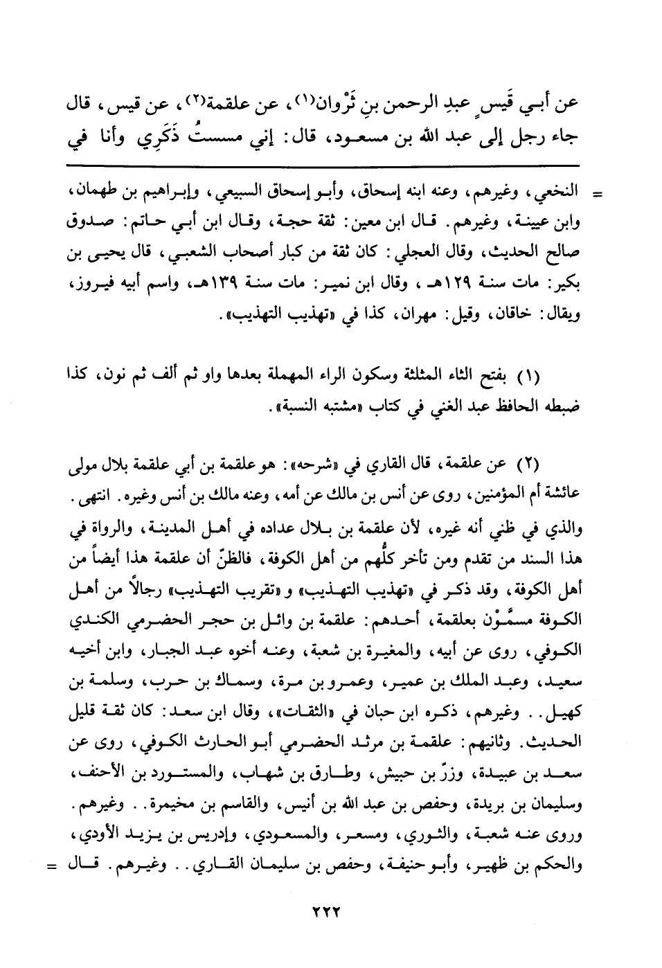 عَنْ أَبِي قَيسٍ عبدِ الرَّحْمَنِ بنِ ثَرْوان (¬1) ، عَنْ عَلْقَمَةَ (¬2) ، عَنْ قَيْسٍ، قَالَ جَاءَ رَجُلٌ إِلَى عَبْدِ اللَّهِ بْنِ مَسْعُودٍ، قَالَ: إِنِّي مسستُ ذَكَرِي وأنا في