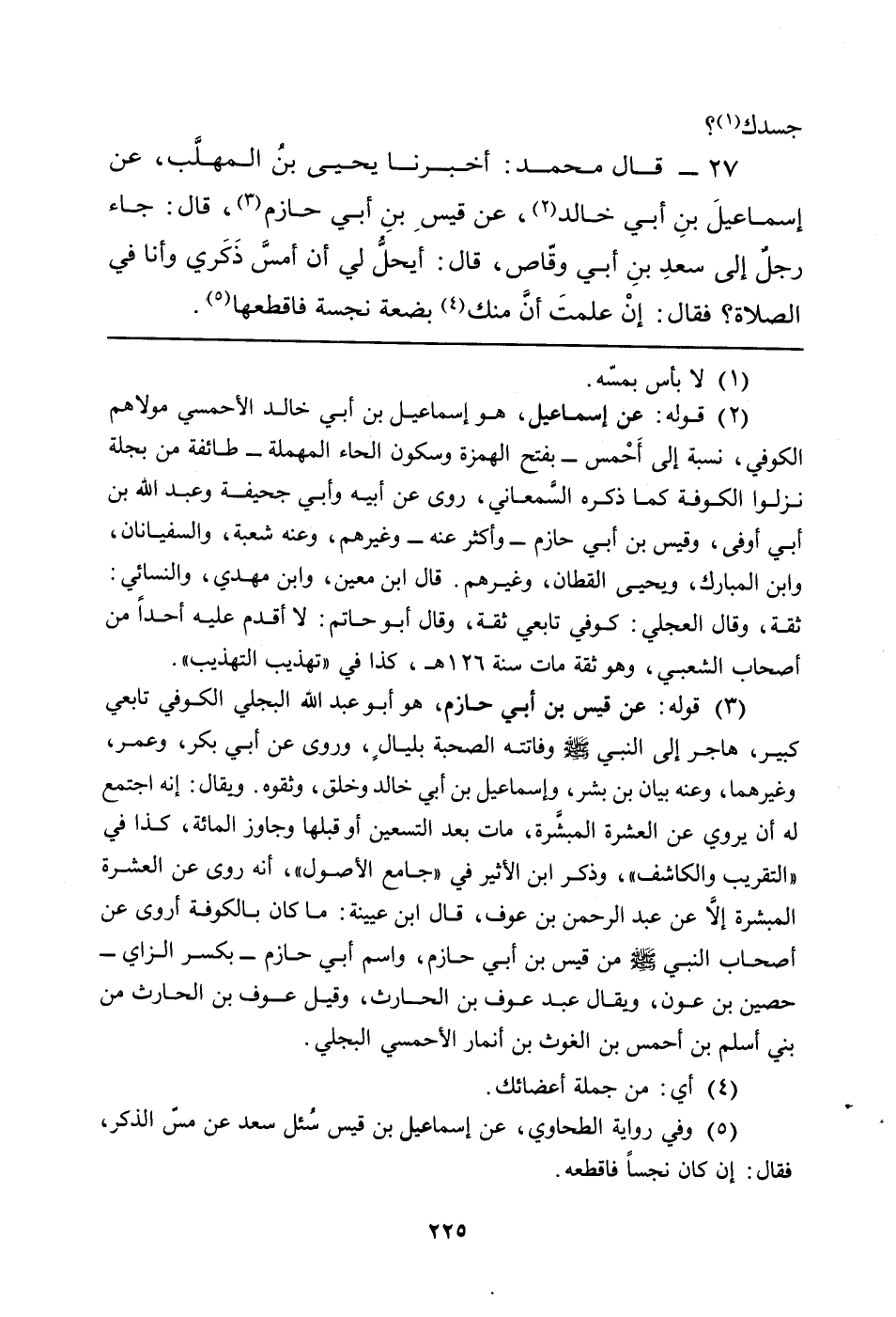 27 - قَالَ مُحَمَّدٌ: أَخْبَرَنَا يَحْيَى بنُ المهلَّب، عَنْ إسماعيلَ بنِ أَبِي خَالِدٍ (¬2) ، عَنْ قيسِ بنِ أَبِي حَازِمٍ (¬3) ، قَالَ: جَاءَ رجلٌ إِلَى سعدِ بْنِ أَبِي وَقَّاصٍ، قَالَ: أيحلُّ لِي أَنْ أمسَّ ذَكَري وَأَنَا فِي الصَّلاةِ؟ فَقَالَ: إنْ علمتَ أنَّ مِنْكَ (¬4) بِضْعَةً نَجِسَةً فَاقْطَعْهَا (¬5) .