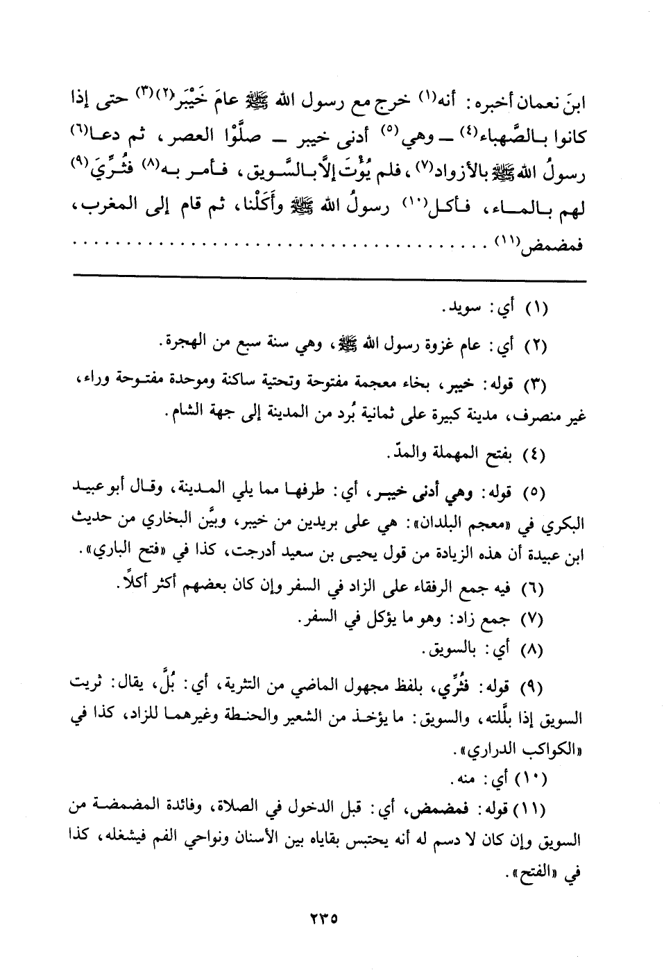 ابن نُعْمَانَ أَخْبَرَهُ: أَنَّهُ (¬1) خَرَجَ مَعَ رَسُولِ اللَّهِ صَلَّى اللَّهُ عَلَيْهِ وَسَلَّمَ عَامَ خَيْبَر (¬2) (¬3) حَتَّى إِذَا كَانُوا بالصَّهباء (¬4) - وَهِيَ (¬5) أَدْنَى خَيْبَرَ - صلَّوا الْعَصْرَ، ثُمَّ دَعَا (¬6) رسولُ اللَّهِ صَلَّى اللَّهُ عَلَيْهِ وَسَلَّمَ بِالأَزْوَادِ (¬7) ، فَلَمْ يُؤْتَ إلاَّ بالسَّويق، فَأَمَرَ بِهِ (¬8) فثُرِّيَ (¬9) لَهُمْ بِالْمَاءِ، فَأَكَلَ (¬10) رَسُولُ اللَّهِ صَلَّى اللَّهُ عَلَيْهِ وَسَلَّمَ وأكَلنا، ثُمَّ قام إلى المغرب، فمضمض (¬11)