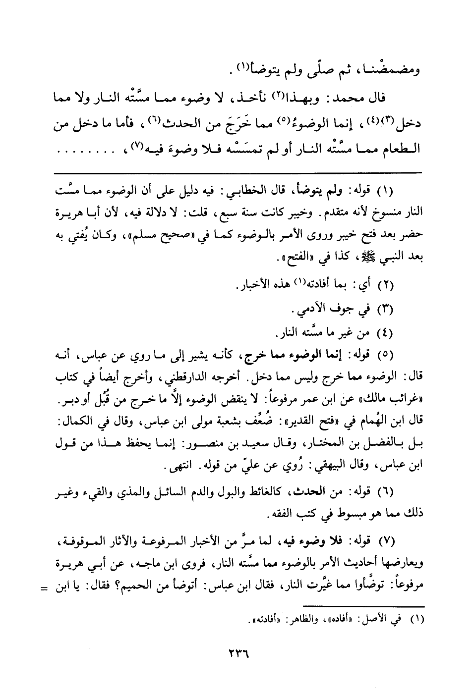(¬7) قوله: فلا وضوء فيه، لما مرَّ من الأخبار المرفوعة والآثار الموقوفة، ويعارضها أحاديث الأمر بالوضوء مما مسَّته النار، فروى ابن ماجه، عن أبي هريرة مرفوعاً: توضَّؤوا مما غيَّرت النار، فقال ابن عباس: أتوضأ من الحميم؟ فقال: يا ابن أخي إذا سمعتَ عن رسول الله صلى الله عليه وسلم حديثاً فلا تضربْ له الأمثال.
