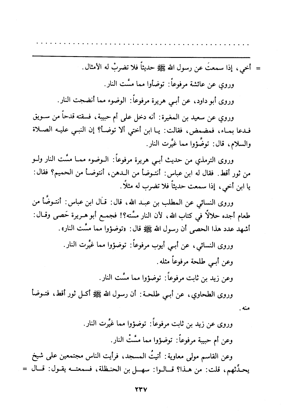 وروى النسائي عن المطلب بن عبد الله، قال: قال ابن عباس: أنتوصَّأ من طعام أجده حلالاً في كتاب الله، لأن النار مسَّته؟ فجمع أبو هريرة حَصى وقال: أشهد عدد هذا الحصى أن رسول الله صلى الله عليه وسلم قال: "توضؤوا مما مسَّت النار".